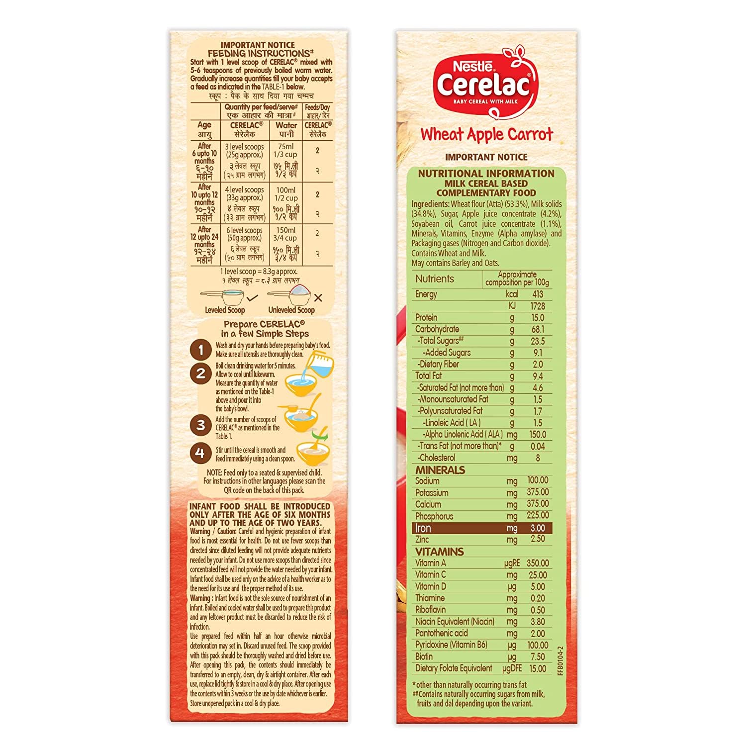 Nestle Cerelac Baby Cereal with Milk is a complementary baby food for infants from 6 to 24 months. While infants and children have higher requirements of nutrients than adults 2 serves of Cerelac Wheat Apple Carrot Cereal provide 37% of a babydaily needof iron. It is also a source of 14 important nutrients including vitamins and minerals. Vitamin A C and Zinc help support normal immune system function. This baby cereal is rich in protein and packed with the goodness of cereal milk fruit and vegetable. With 155 years of scientific expertise in infant nutrition Nestle develops infant nutrition products backed by evolving science and research. Innovation has been at the heart of Nestle since its beginning. Usage: Step 1: Wash and dry your hands before preparing baby's food. Make sure all utensils are throughly clean. Step 2: Boil clean drinking water for 5 minutes. Allow to cool until lukewarm. Measure the quantity of water as mentioned on the table-1 above and pour it into the babybowl. Step 3: Add the number of scoops of CERELAC as mentioned in the table 1. Step 4: Stir until the cereal is smooth and feed immediately using a clean spoon. Warning: Infant food should be used only on advice of a health worker as to the need for its use. Discard unused feed. Infant food is not the sole source of nourishment. Storage Instructions - After opening the pack the contents should immediately be transferred to an empty clean dry and airtight container. After each use replace lid tightly & store in a cool dry and hygenic place.