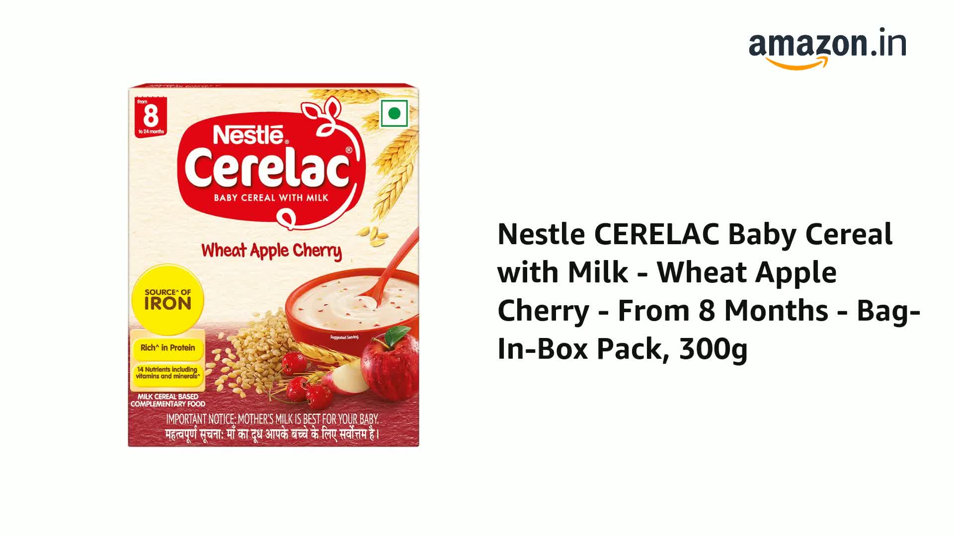 CERELAC Baby Food Cereal | Wheat Apple Cherry for 8 to 24 Months Baby | Source of Iron & Protein | Instant Baby Food Cereal | 350g