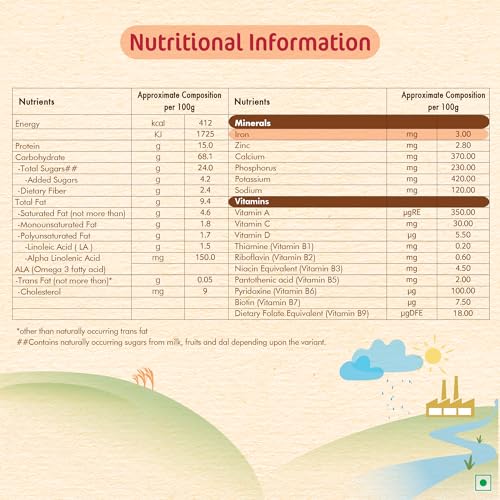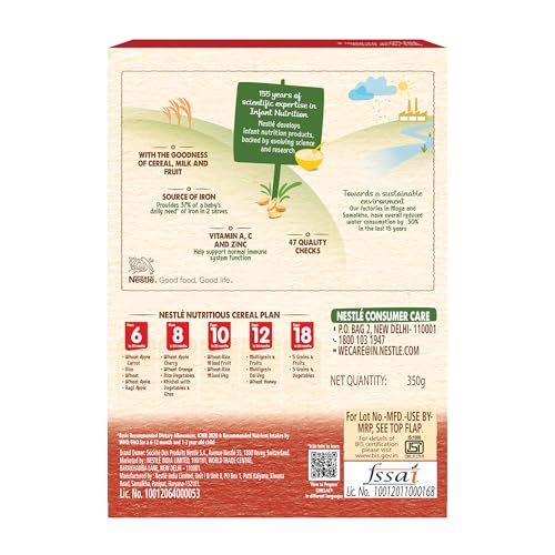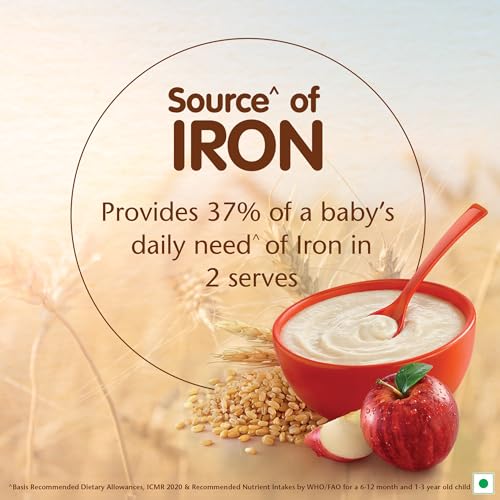 Nestle Cerelac Baby Cereal with Milk is a complementary baby food for infants from 6 to 24 months. While infants and children have higher requirements of nutrients than adults 2 serves of Cerelac Wheat Apple Cereal provide 37% of a babydaily needof iron. It is also a source of 14 important nutrients including vitamins and minerals. Vitamin A C and Zinc help support normal immune system function. This baby cereal is rich in protein and packed with the goodness of cereal milk and fruit. With 155 years of scientific expertise in infant nutrition Nestle develops infant nutrition products backed by evolving science and research. Innovation has been at the heart of Nestle since its beginning. Usage: Step 1: Wash and dry your hands before preparing baby's food. Make sure all utensils are throughly clean. Step 2: Boil clean drinking water for 5 minutes. Allow to cool until lukewarm. Measure the quantity of water as mentioned on the table-1 above and pour it into the babybowl. Step 3: Add the number of scoops of CERELAC as mentioned in the table 1. Step 4: Stir until the cereal is smooth and feed immediately using a clean spoon. Warning: Infant food should be used only on advice of a health worker as to the need for its use. Discard unused feed. Infant food is not the sole source of nourishment. Storage Instructions - After opening the pack the contents should immediately be transferred to an empty clean dry and airtight container. After each use replace lid tightly & store in a cool dry and hygenic place.