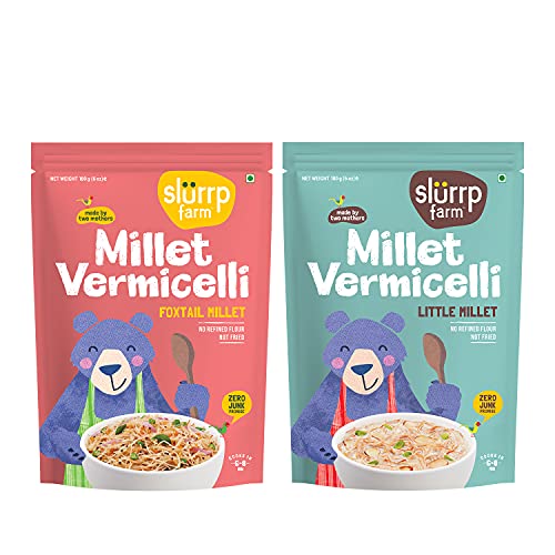 Slurrp Farm Porridge Millet And Oats Powder | Instant Healthy Wholesome Food No Added Sugar No Milk 250 GMade from the goodness of 100% organic millets - jowar and foxtail millet and oats. This porridge is a rich source fibre iron protein. No added salt or sugar.Slurrp Farm Millet Vermicelli Semiya No Maida No White Rice Foxtail Millet and Little Millet Vermicelli 180 g each (Pack of 2)No maida no white rice. Zero trans fat saturated fat and cholesterol