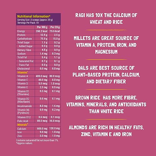 • Made from 7 Superfood flours - Ragi Jowar Foxtail Millet Moong Dal Bengal Gram (Chana Dal) Brown Rice and Almond flour.