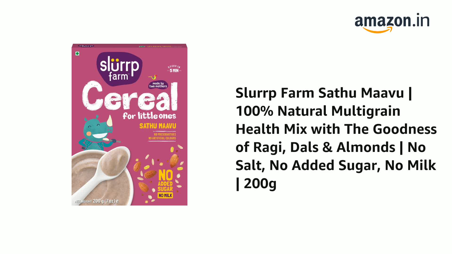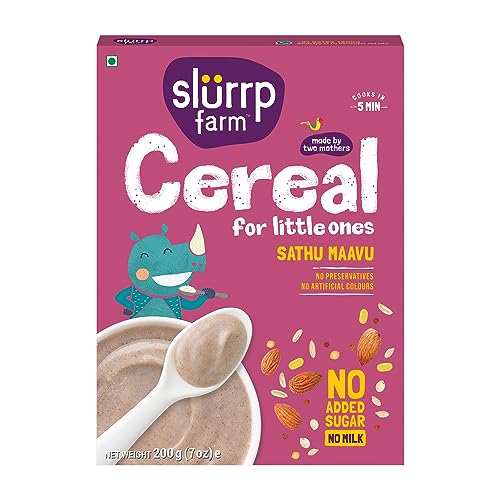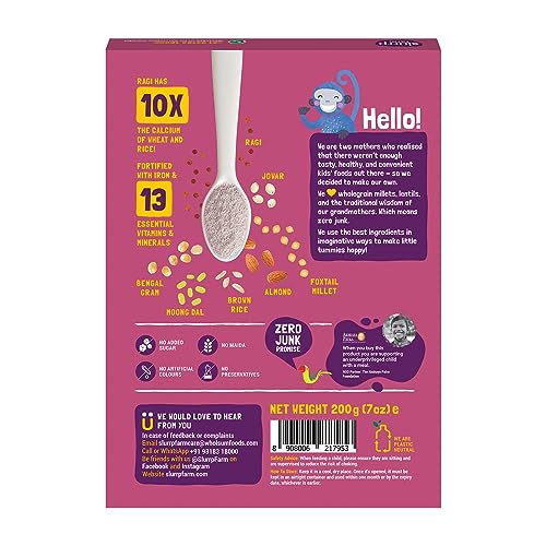 Ingredients: Ragi Jowar(Sorghum) Foxtail Millet Moong Dal Bengal Gram Brown Rice Almond Flour Cardamom powder Vitamins and Minerals How to Use: 1. Add 1/2 cup of water or milk into a pan 2. Add 3 level table spoons (30 gms) of Sathu Maavu mix 3. Mix well to remove the lumps 4. Cook on a medium flame for 3-5 mins and stir continuously to avoid lumps 5. Cool to room temperature and feed immediately | Once the pack is opened transfer the contents to an airtight container store in cool dry place or in a refrigerator | At Slurrp Farm brand made by 2 Mothers we are passionate about raising awareness of healthy eating for children and giving busy parents like us the convenience needed in terms of being able to find food options which are as good as what we would make at home.