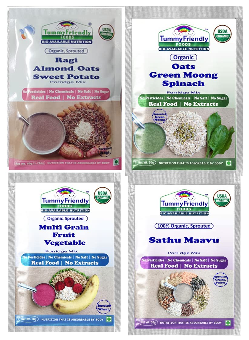 TummyFriendly Foods Certified Organic Porridge Mixes Trial Packs Combo For Little Ones | Organic Sprouted Ragi, Oats, Banana, MultiGrain, Oats, Sathu Maavu | Made of Organic Sprouted Ragi Flour, Organic Sprouted Pulses, Fruit, Vegetables and Nuts | Maximu