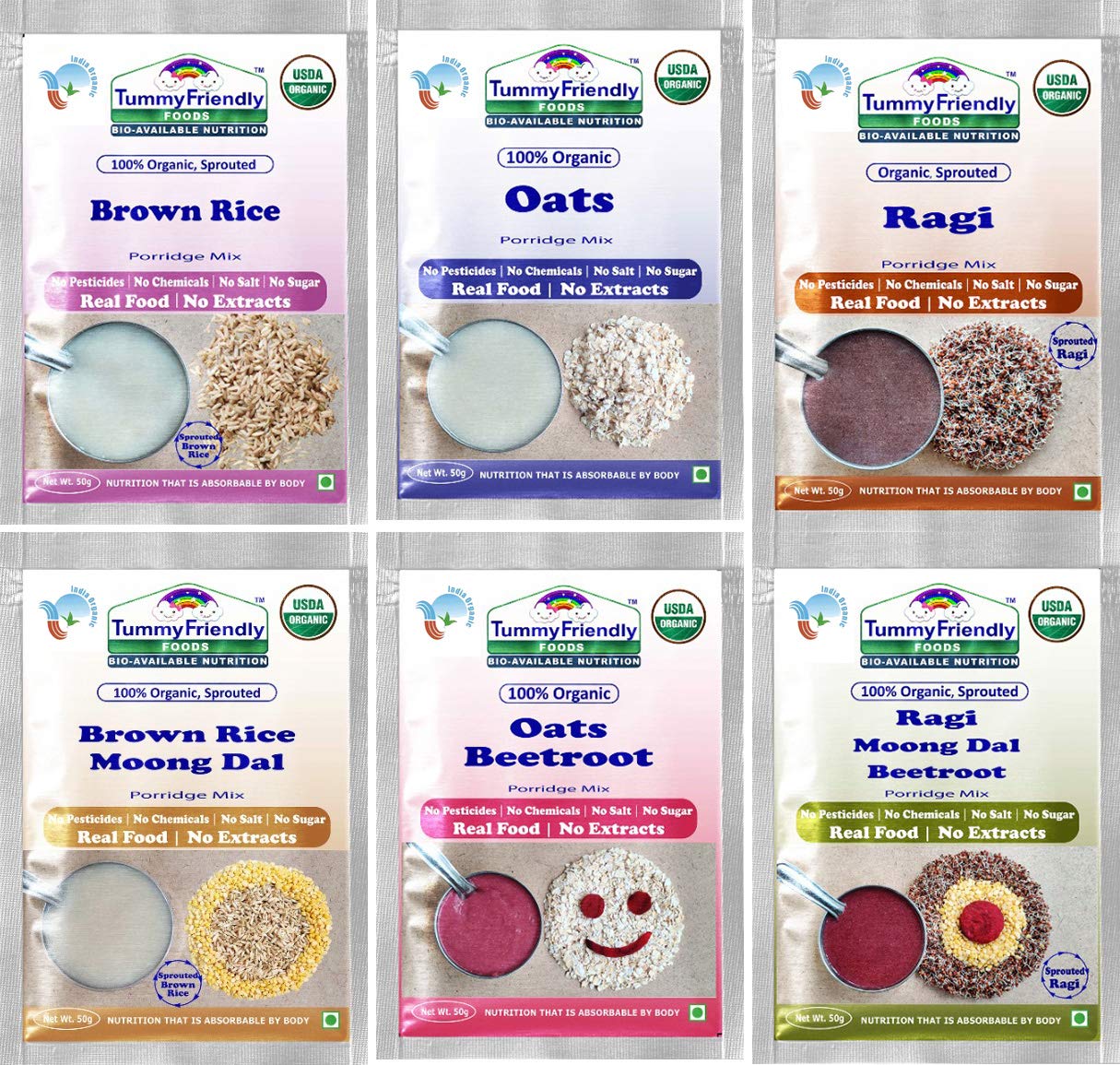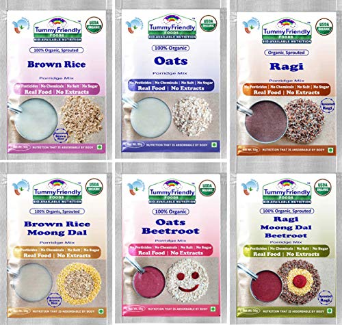 Certified Organic. NO CHEMICAL FORTIFICATION No Sugar No Salt No Milk No Pesticides & No GMO SPROUTS THE LIVING SUPER-FOOD ON THE PLANET. Sprouts are rich in Vitamins Minerals Fibre Anti-oxidants Enzymes Amino-acids and Essential Fatty Acids. When sprouted these little grains & pulses germinate into Baby plants. These Baby plants carry the all nutrients to grow into big plants. In fact Sprouting is Mother-Natureâs way of fortifying the food. Sprouts are also called Sattvic Food. The germination process in Whole Grains eliminates Anti-Nutrients and increases the nutrition levels & their bio-availability significantly. Sprouted Brown Rice is a good source of Gamma-Aminobutyric Acid (GABA) a neurotransmitter that strengthens the central nervous system. Oats are famous for Beta-Glucan a soluble fibre that promotes heart health and healthy gut bacteria. Sprouted Ragi is rich in Calcium and Iron which promote bone growth and overall development. TummyFriendly Foods: Maximum Possible Bio-available Nutrition from Real Food. No extracts no unhealthy ingredients Freshly-made in Small Batches. Can be cooked under 5 min. Sprouted grains so easy to digest. 9 Month Shelf life
