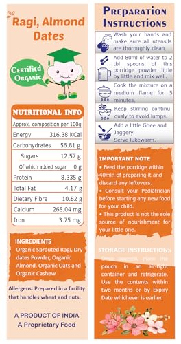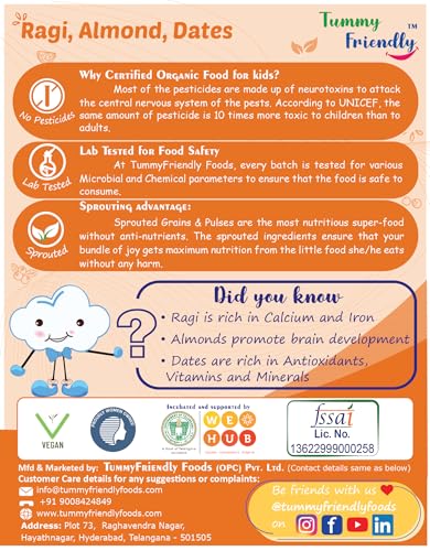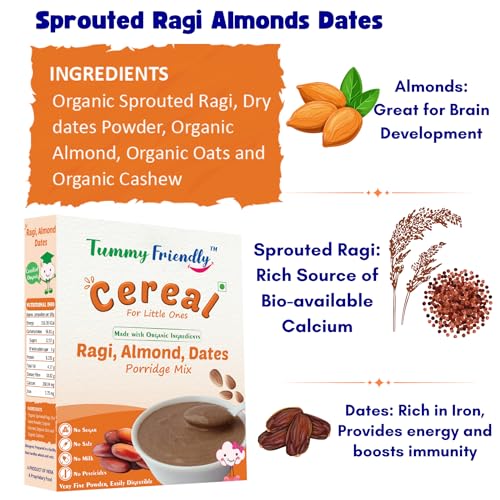 TummyFriendly Foods Organic Sprouted Ragi Almond Dates Porridge Mix | Made of Sprouted Ragi Powder for babies | Available in Trial Packs too. Baby cereal 8 months | Baby Food for 8 months Shelf-life 9 month | 200g (Almond)