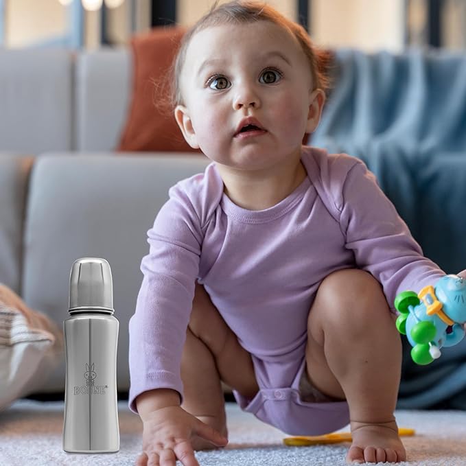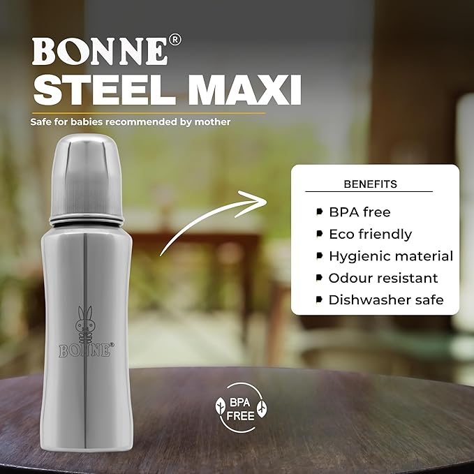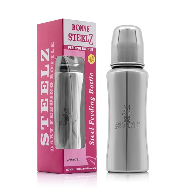 Give your baby the best with BONNE 250ml Stainless Steel Baby Feeding Bottle, designed to ensure safe, hygienic, and comfortable feeding. This plastic-free steel baby bottle is crafted from high-quality, rust-proof stainless steel milk bottle , making it a durable, non-toxic, and odour-free baby feeder for newborns, infants, and toddlers up to 3 years. Whether you're looking for a milk bottle for kids 1 year, a steel feeding bottle for 2 year baby, or a steel milk bottle for kids 2 years, this bottle is the perfect choice.