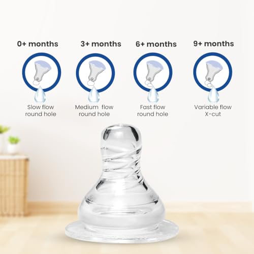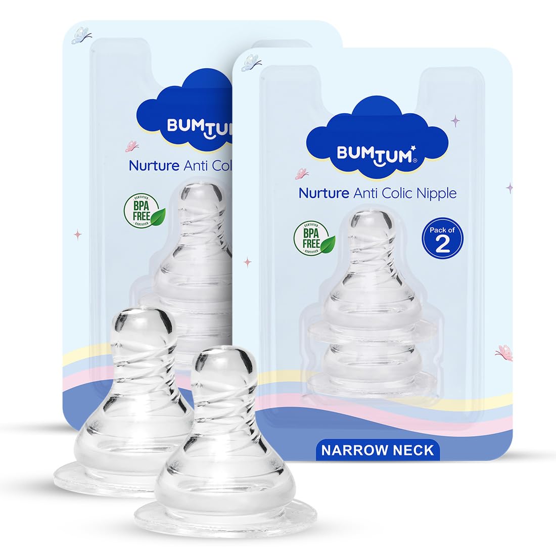 BUMTUM Nurture Anti Colic Teat/Nipple for Narrow Neck Bottle |4pcs- Medium Size |Bottle Nipple for Baby 6m+ | Soft & Flexible Silicone| Leak Proof Bpa Free