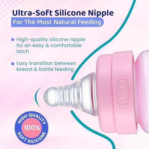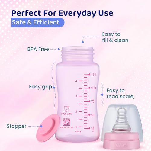 Chicco Feed Easy Milk Feeding Bottle for Babies & Toddlers, V-Shaped Anti-Colic System to Prevent Colic, Gas & Discomfort, BPA-Free, Slow Flow, 0m+ (125ml, Pink)