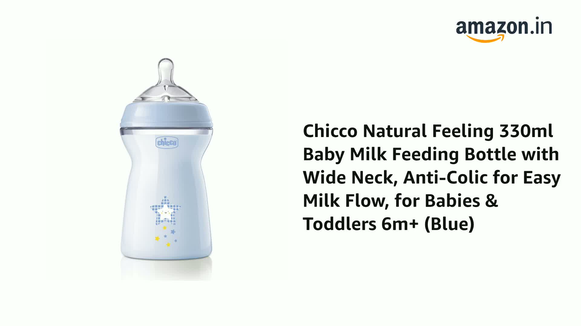 Chicco Natural Feeling Feeding Bottle for Babies, 330ml (6+ Months)|Mother Breast Like Teats|Soft Silicon, Anti-Colic Teat | Angled Teat Suitable for Newborns | with Anti-Drip Cap | BPA Free (Blue)