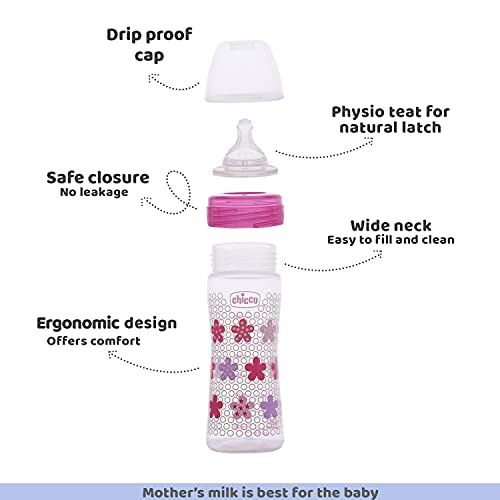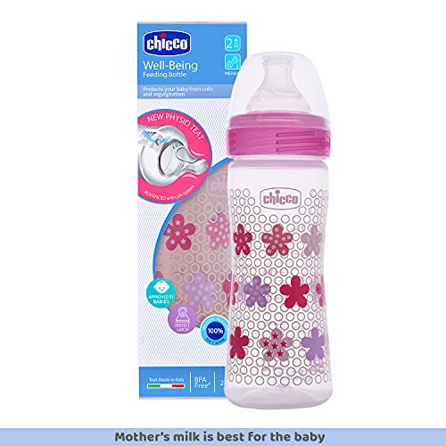 Chicco Well-Being Feeding bottles are especially designed to provide the baby with a comfortable and relaxed feeding experience. To give baby the natural feeding experience Well-Being feeding bottle comes with an advanced teat i.e. Physio teat whose shape has been inspired from the shape of the motherâs nipple to promote the babyâs natural sucking movement. The anti-colic valve situated at the base of the teat helps to prevent the ingestion of air and promotes a constant flow of milk thus reducing the risk of colic regurgitation hiccups or any discomfort to the baby. The symmetrical elongated and flattened shape of the Physio teat that mimics the motherâs nipple fits perfectly to the babyâs mouth and promotes the physiological movement of babyâs tongue. Making it more preferable for babies the soft and hygienic silicone teat gives a soothing and pleasant feel to the baby helping in easy transition between breastfeeding and bottle feeding and vice-versa. The ergonomic shape of the bottle is easy to hold and grip even by babyâs little hands. Chicco Well Being Bottle is made with high-quality BPA-free polypropylene material that ensures maximum protection and hygiene. For parentâs ease the bottle has a wide neck design which provides easy and quick filling and is effortless to wash. Drip poof cap and bottle gear ensure safe closure and no leakage from the bottle. Easy to clean the Chicco Well-Being baby bottles are available in beautiful colours & decorations and are ideal for babyâs everyday feeding routine.