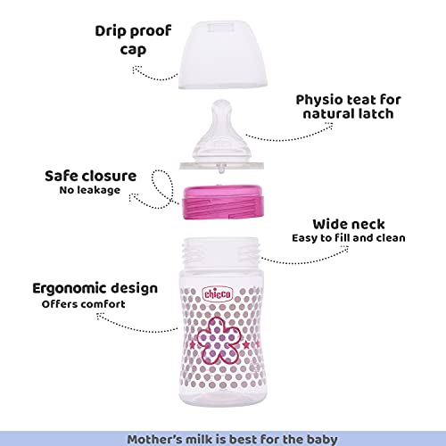 Chicco Well-Being Feeding bottles are especially designed to provide the baby with a comfortable and relaxed feeding experience. To give baby the natural feeding experience Well-Being feeding bottle comes with an advanced teat i.e. Physio teat whose shape has been inspired from the shape of the motherâs nipple to promote the babyâs natural sucking movement. The anti-colic valve situated at the base of the teat helps to prevent the ingestion of air and promotes a constant flow of milk thus reducing the risk of colic regurgitation hiccups or any discomfort to the baby. The symmetrical elongated and flattened shape of the Physio teat that mimics the motherâs nipple fits perfectly to the babyâs mouth and promotes the physiological movement of babyâs tongue. Making it more preferable for babies the soft and hygienic silicone teat gives a soothing and pleasant feel to the baby helping in easy transition between breastfeeding and bottle feeding and vice-versa. The ergonomic shape of the bottle is easy to hold and grip even by babyâs little hands. Chicco Well Being Bottle is made with high-quality BPA-free polypropylene material that ensures maximum protection and hygiene. For parentâs ease the bottle has a wide neck design which provides easy and quick filling and is effortless to wash. Drip poof cap and bottle gear ensure safe closure and no leakage from the bottle. Easy to clean the Chicco Well-Being baby bottles are available in beautiful colours & decorations and are ideal for babyâs everyday feeding routine.