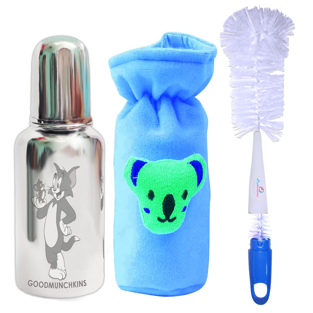 Goodmunchkins Stainless Steel Baby Feeding Bottle 304 Grade Steel/Velvet Bottle Cover/Nylone Bottle Cleaning Brush (3 Items)