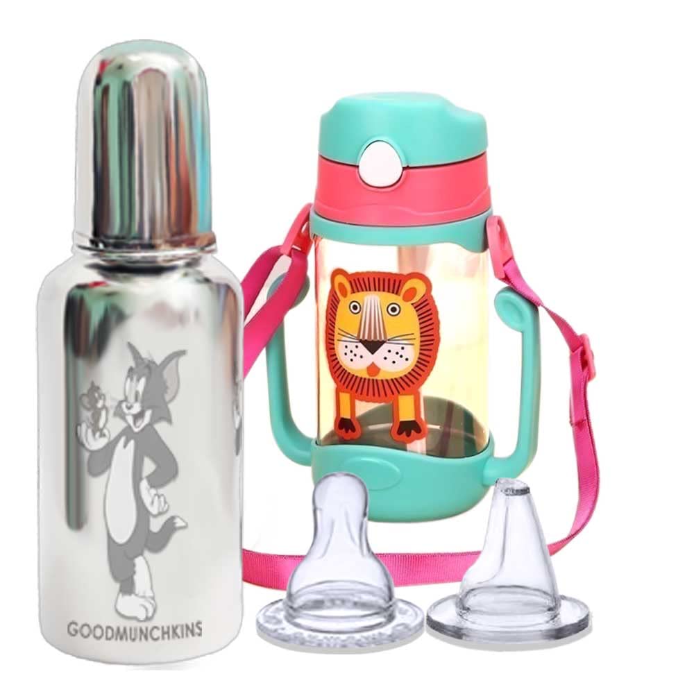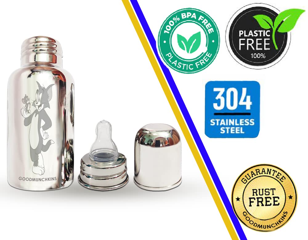 Goodmunchkins Stainless Steel Feeding Bottles opt for Newborn Baby/Infants/Toddlers. The size available 75150220280300ml Capacity. The Bottle is made of 304 Grade Steel without any welding Joints in the Bottle hence there is Rust Free Insides and Outside of the the Bottle considering Hygiene and Health of your Baby. The Bottle is made 100% No Leakage in the neck side There is more quality checks Before Dispatch the Bottle to the Customer. Mirror finishing Bottle we can store Milk/Water/Juice/Soup. Lightweight so baby can hold easily at the same time it very strong product. The Nipple is made of Food Grade Silicone. Extra soft medical-grade silicone spout provides an easy transition from bottle-feeding. Smooth Design with no sharp curves or edges keeping in mind Easy and Safe cleaning of the bottle. Easy to Carry Easy to Handle and Easy to Clean. No smell. No mess. The bottle is of sleek design and is very convenient while handling. Reduces sterilization work. Only Silicon Nipple needs to be sterilized. The bottle can be washed with Soap and Water Made in India.