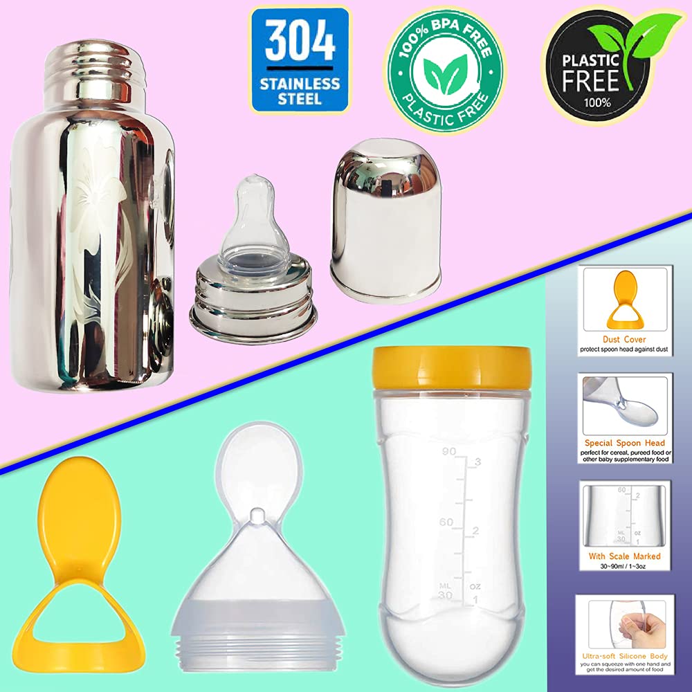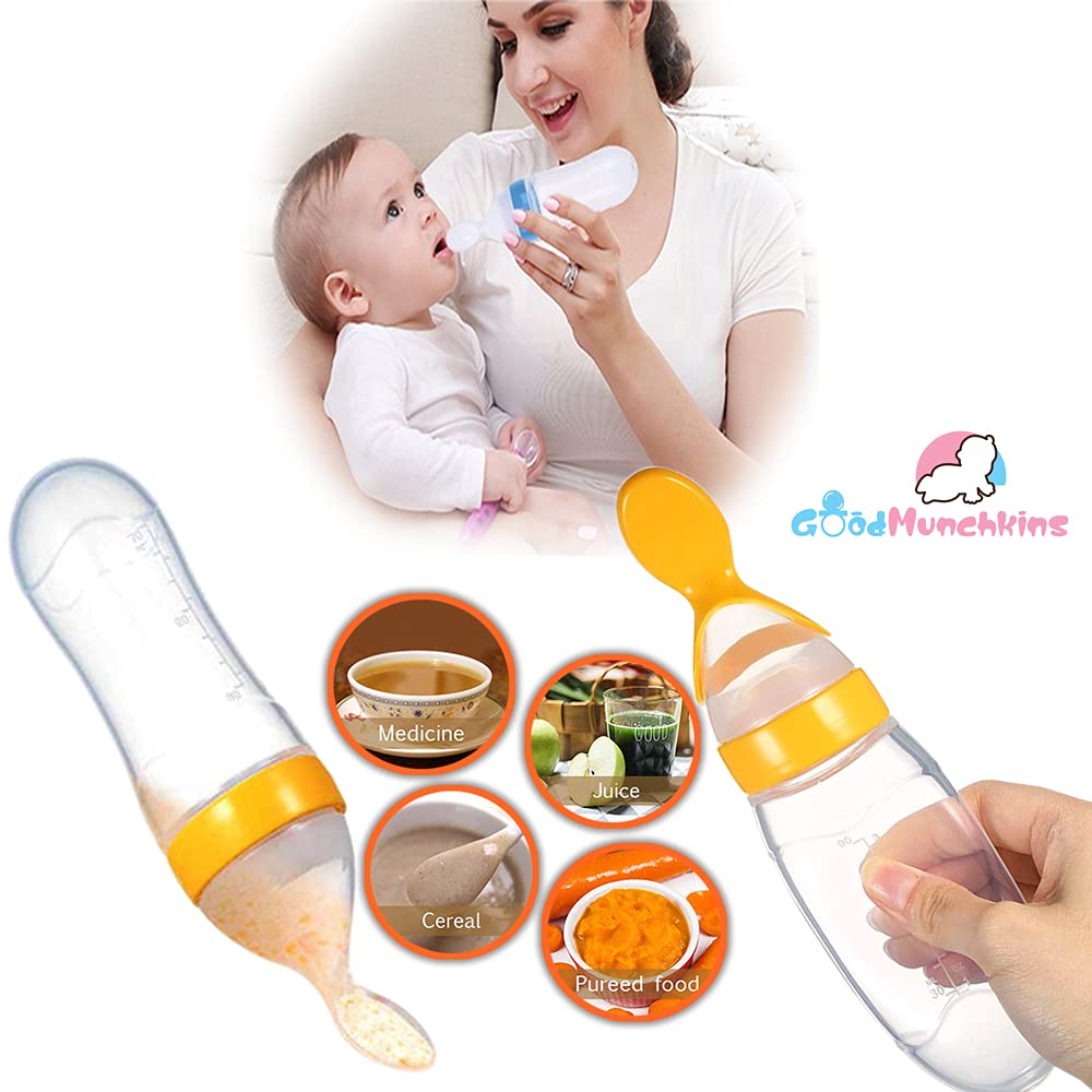 GOODMUNCHKINS Stainless Steel Baby Feeding Bottle - Silicon Food Feeder Silicone Spoon Feeder makes baby feeding easy for Parents. Ideal for 6 months and up babies this all-in-one feeder makes it a lot quicker and easier to feed a fussy baby. Baby Spoon Feeder has a stand-up design for convenience and hygiene.The Baby Feeder spoon and bottle are made of food-grade silicone Soft enough to touch babies' mouth. Clean the Silicone Spoon Feeder before use all parts can be sterilized or boiled in water for 3 to 5 minutes. A convenient way to feed your baby first pureed foods and cereals and help make feeding time more easier and less messy. Gently squeeze the Spoon Feeding Bottle until the desired amount of food collects onto the spoon to feed the baby.