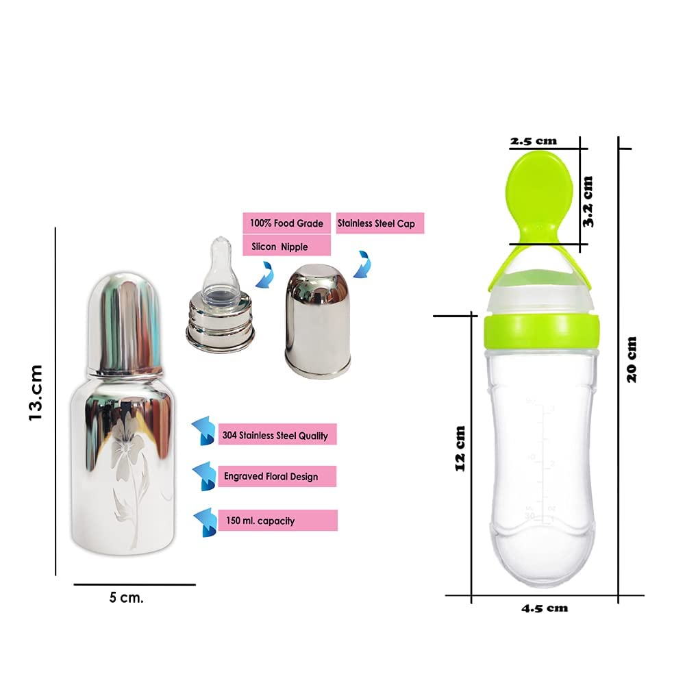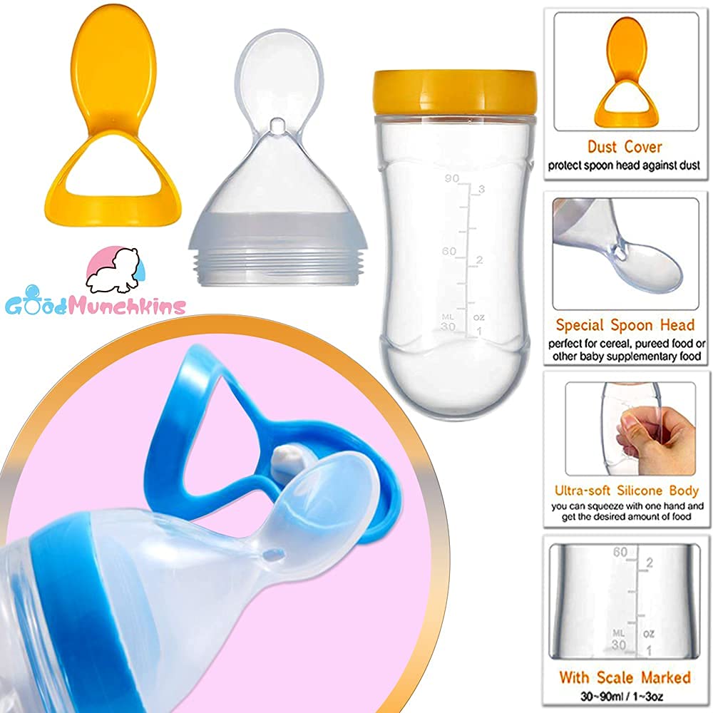 GOODMUNCHKINS Stainless Steel Baby Feeding Bottle - Silicon Food Feeder Silicone Spoon Feeder makes baby feeding easy for Parents. Ideal for 6 months and up babies this all-in-one feeder makes it a lot quicker and easier to feed a fussy baby. Baby Spoon Feeder has a stand-up design for convenience and hygiene.The Baby Feeder spoon and bottle are made of food-grade silicone Soft enough to touch babies' mouth. Clean the Silicone Spoon Feeder before use all parts can be sterilized or boiled in water for 3 to 5 minutes. A convenient way to feed your baby first pureed foods and cereals and help make feeding time more easier and less messy. Gently squeeze the Spoon Feeding Bottle until the desired amount of food collects onto the spoon to feed the baby.