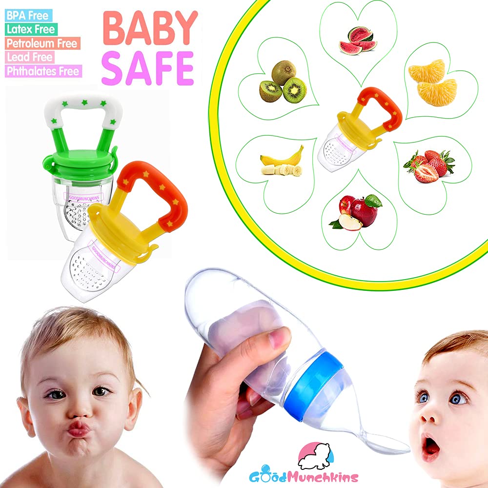 GOODMUNCHKINS Stainless Steel Baby Feeding Bottle - Silicon Food Feeder Silicone Spoon Feeder makes baby feeding easy for Parents. Ideal for 6 months and up babies this all-in-one feeder makes it a lot quicker and easier to feed a fussy baby. Baby Spoon Feeder has a stand-up design for convenience and hygiene.The Baby Feeder spoon and bottle are made of food-grade silicone Soft enough to touch babies' mouth. Clean the Silicone Spoon Feeder before use all parts can be sterilized or boiled in water for 3 to 5 minutes. A convenient way to feed your baby first pureed foods and cereals and help make feeding time more easier and less messy. Gently squeeze the Spoon Feeding Bottle until the desired amount of food collects onto the spoon to feed the baby.