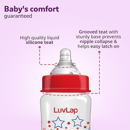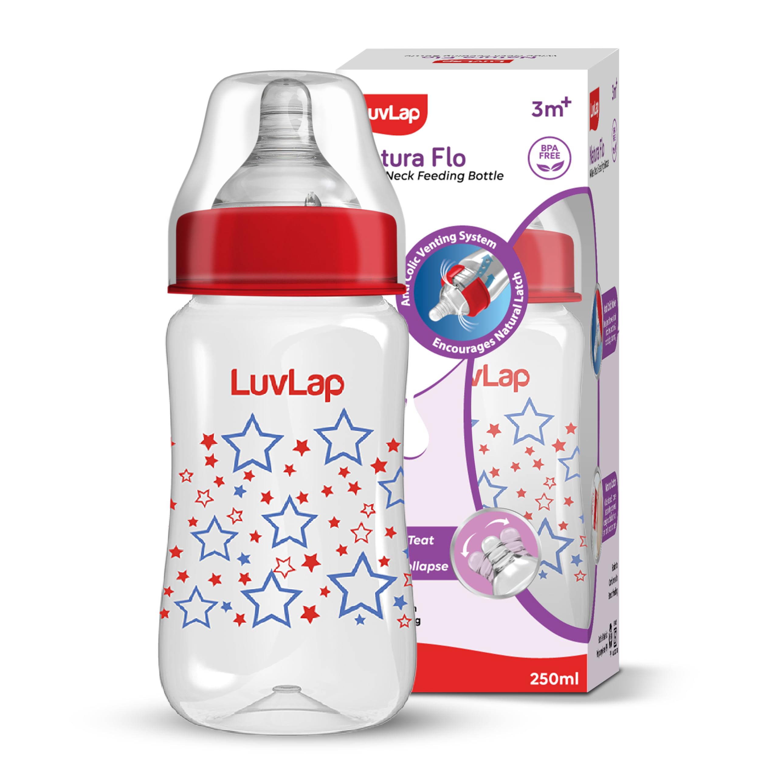LuvLap Natura Flow Feeding Bottles are ergonomically designed to be easily held while feeding the baby. All LuvLap bottles are 100% BPA free and fully sterilizable. The teats are 100% Liquid Silicone and have an anti-colic valve that vents air into the bottle preventing any air from entering the babys tummy. The teat has grooves at the tip which encourage peristaltic suckling while the wide base helps the baby get a natural latch similar to that on the mothers breast. This helps easy transition between breastfeeding & bottle feeding. The grooved teats and superior silicone quality ensure no nipple collapse helping in an uninterrupted feed.