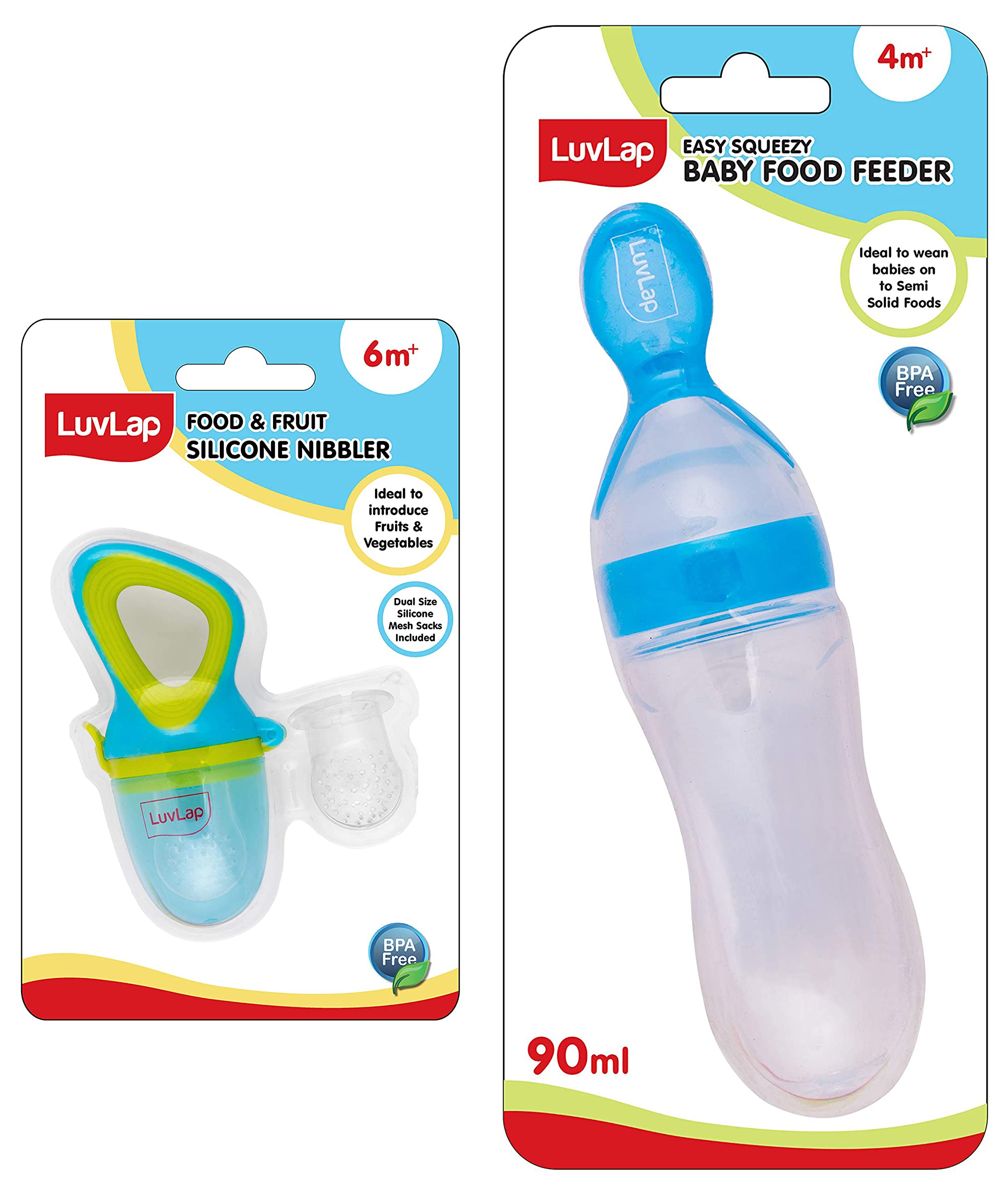 LuvLap Feeding Spoon with Squeezy food Grade Silicone Feeder bottle For Infant Baby 90ml BPA FreeBlueSoft Silicone food feeding bottle with spoon can be used to feed puries juice milk or water to babies. Helps in easy transition. Effortless one hand feeding. Dust cover and disk make it easy to keep and carry.LuvLap Silicone Food/Fruit Nibbler with Extra Mesh Soft Pacifier/Feeder Teether for Infant Baby Infant Elegant Blue BPA FreeFruit nibbler and teething toy to provide gentle relief to gums. Serves dual purpose of feeding fruit and vegetables to babies and can also be used as a teether. Can be filled with chilled fruits/vegetables to provide added relief. Made with bpa free food grade plastic and soft silicone it comes in attractive handle designs to EN gage the baby and is easy to hold and nibble upon.