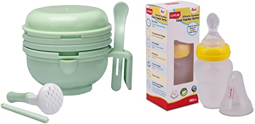 LuvLap 9 in 1 Baby Food Masher Mill Food Grinder Cum Processor with Multifunction Textured Mashing & Filtering Plates with Serving Bowl (Light Green)LuvLap 9 in 1 Baby Food Processor is Made of BOA Free PP material. It is nontoxic odor free and tasteless. It's different types of grinding modes include juicing filtering crushing and holding food. It could be used to grind fruits & vegetables meat and fishes into smooth paste. Different grinding filter has different use thegrinding filter with a lot of triangle bulges is for making blanketcarrot or cucumber the filter covered with small holes is used formaking fruit juice.It is easy to clean. Just rinse it with running water & let it dryLuvLap Easy Squeezy Food Feeder - 180 mlSoft silicone food feeding bottle with spoon can be used to feed puries juice milk or water to babies. Helps in easy transition. Effortless one hand feeding. Extra soft silicone spoon protects baby's teeth. Dust cover to maintain hygiene.