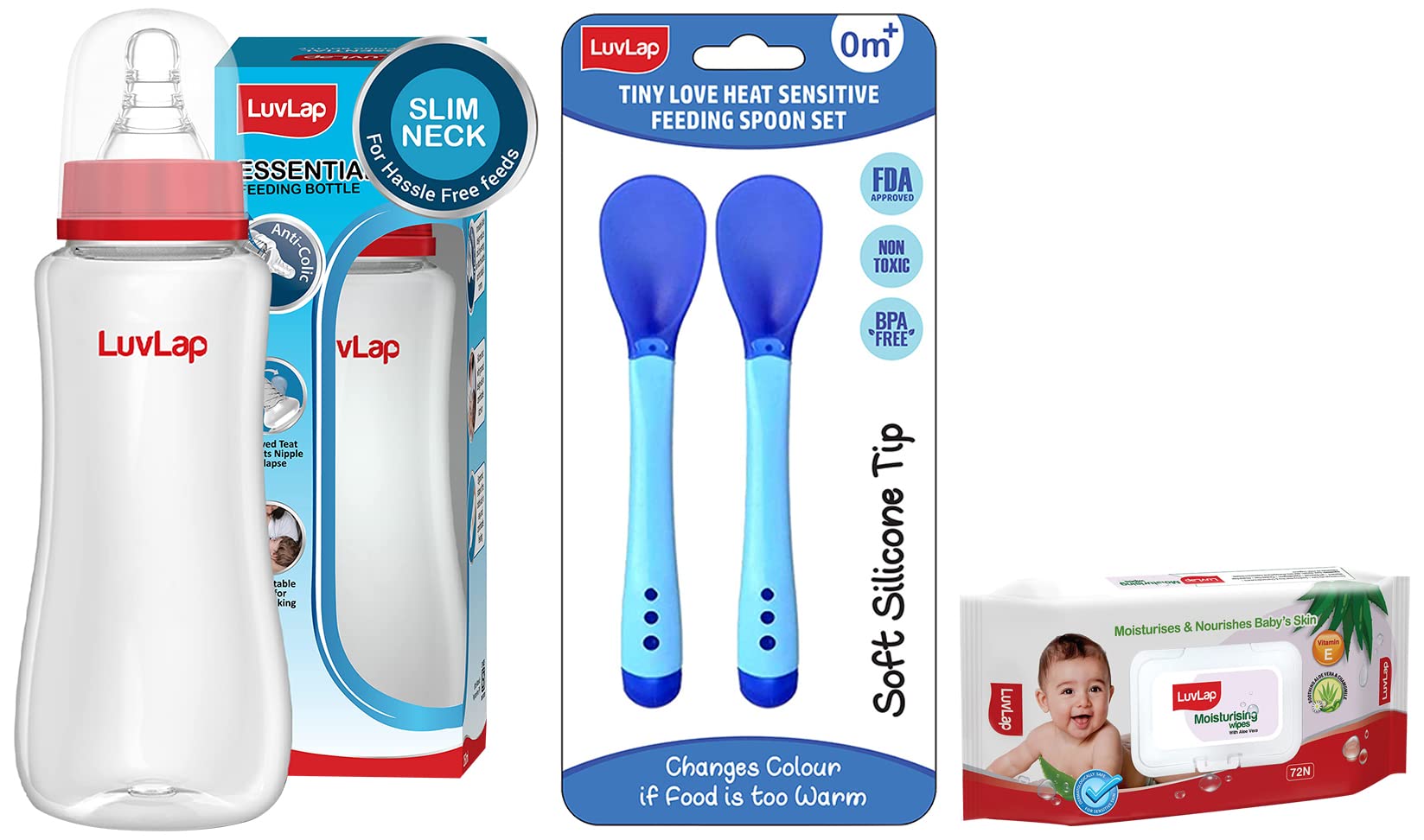 LuvLap Anti-Colic Slim/Regular Neck Essential Baby Feeding Bottle 250ml New Born/Infants/Toddler Upto 3 Years BPA FreeLuvLap Essential Feeding Bottles are ergonomically designed to be easily held while feeding the baby. All LuvLap bottles are 100% BPA free and fully sterilizable. The teats are 100% Liquid Silicone and have an anti-colic valve that vents air into the bottle preventing any air from entering the babys tummy. The teat has spiral grooves at the tip which encourage peristaltic suckling and help the baby get a comfortable latch. The grooved teats and superior silicone quality ensure no nipple collapse helping in an uninterrupted feed. With the LuvLap Essential Feeding Bottles at your side your babys feed will always be a comfortable oneLuvLap Tiny Love Heat Sensitive Baby Feeding Spoons Set Food Grade PP Kids & Baby Spoon with Soft Silicone Tip Color changing BPA Free FDA Apporved 2 pcs BlueLifeÂs little stories bloom with coming of the little one in your life. It completes your life with many joys of parenthood. For baby itÂs the next best thing to being in your arms. Entertain your little one and give him or her a personal resting place. LuvlapÂs high chairs cots walkers and other indoor products will have the whole household floored by babyÂs happy smiles and chuckles. At Luvlap we endeavour to weave the little stories into our products with an emphasis on child safety and enrichment of features. So that your little one gets the comfort thatÂs next only to the warmth of your lap. Conceived with care and made using the latest marvels of science all Luvlap products undergo multiple quality checks before they are dispatched to the stores. The products are available at all leading baby gear and online stores and conform to the european standards.LuvLap Paraben Free wipes for baby skin with Aloe Vera Fragrance Free pH Balanced Dermatologically Safe Baby Wipes Rich in Vitamin E & chamomile extract 72 Wipes With Lid PackLuvLap Moisturizing Baby Wipes with aloe vera are the perfect wipes for your baby's delicate skin. Enriched with the goodness of Aloe Vera & Chamomile they are completely free of alcohol and harmful parabens. The pack also comes with a lid seal to ensure the quality remains consistent over time. After all your baby's safety is our prime concern.