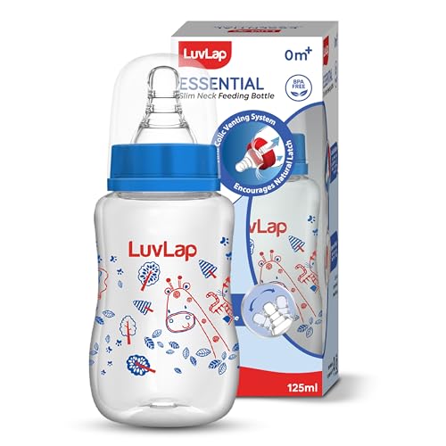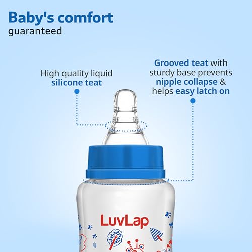 LuvLap Essential Feeding Bottles are ergonomically designed to be easily held while feeding the baby. All LuvLap bottles are 100% BPA free and fully sterilizable. The teats are 100% Liquid Silicone and have an anti-colic valve that vents air into the bottle preventing any air from entering the babys tummy. The teat has spiral grooves at the tip which encourage peristaltic suckling and help the baby get a comfortable latch. The grooved teats and superior silicone quality ensure no nipple collapse helping in an uninterrupted feed. With the LuvLap Essential Feeding Bottles at your side your babys feed will always be a comfortable one