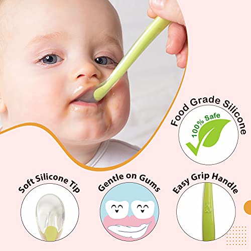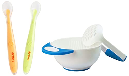 LuvLap Baby Feeding Spoon Set of 2 with ultra supple 100% Silicone Tip BPA Free material with Food Grade Silicone tip Self Feeding Utensil Baby Weaning Spoon for Kids 4 Months+ (Green & Pink)LuvLap Silicone weaning (self feeding) spoon has an ultra supple silicone tip especially designed for a baby's transition from teat to spoon. The soft spoon is soft on baby's gums and completely safe for gums. It's long wide ergonomic handle designed for adult hands to grip easily while feeding and is bowls. The spoon is made of premium food grade silicone. Cleaning is easy & it is dishwasher friendly.LuvLap Baby Food Grinding Cum Feeding Bowl Portable Baby Food Masher & Serving Bowl for Baby weaning Food Preparation (White & Blue)LuvLap LuvLap Baby Food Grinding cum Feeding Bowl is Made of BPA Free PP material. It is nontoxic odor free and tasteless. It can be used to grind fruits & vegetables meat and fishes into smooth paste and pureed food. It is easy to clean. Just rinse it with running water & let it dry