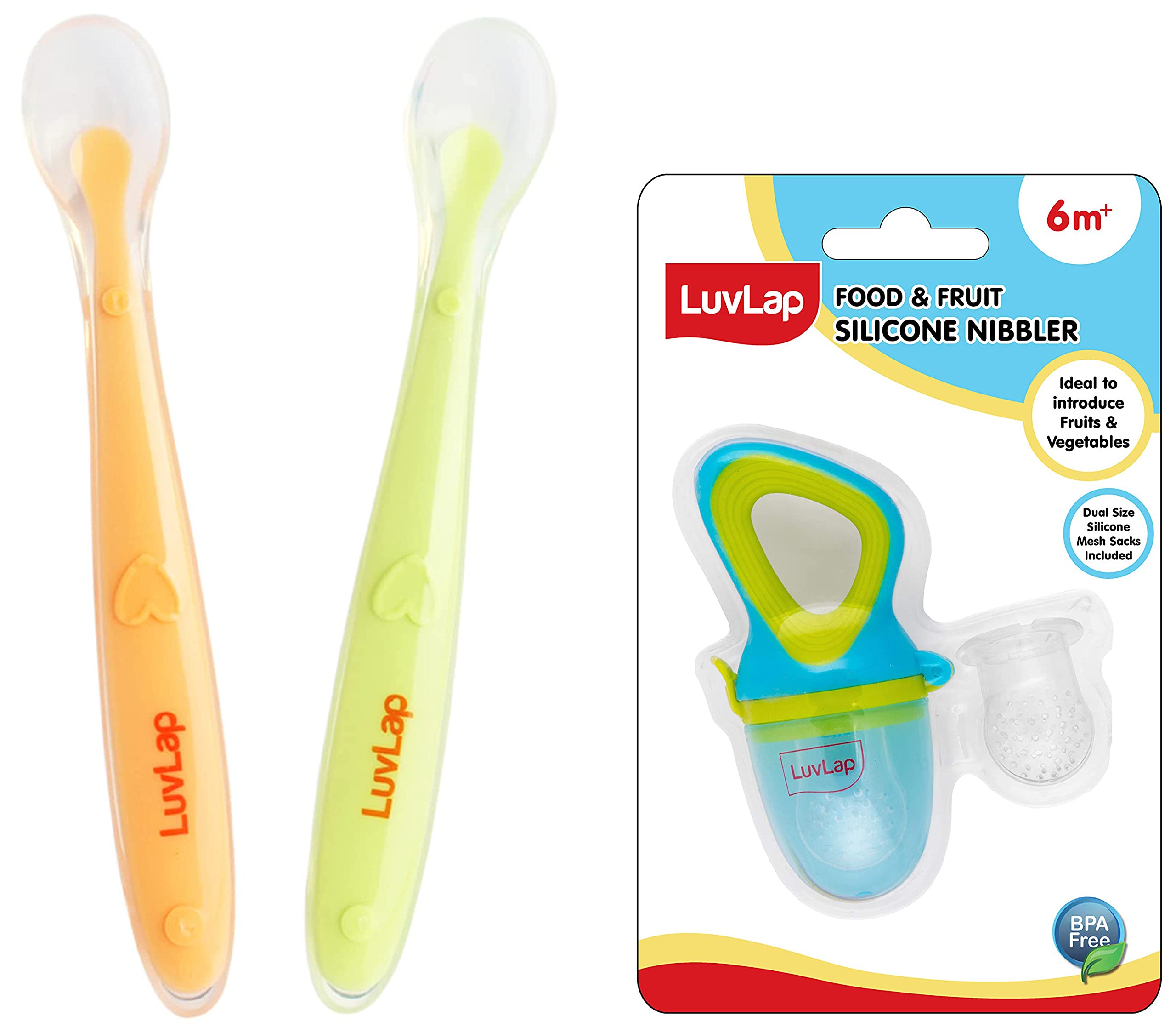 LuvLap Baby Feeding Spoon Set of 2 with ultra supple 100% Silicone Tip BPA Free material with Food Grade Silicone tip Self Feeding Utensil Baby Weaning Spoon for Kids 4 Months+ (Green & Pink)LuvLap Silicone weaning (self feeding) spoon has an ultra supple silicone tip especially designed for a baby's transition from teat to spoon. The soft spoon is soft on baby's gums and completely safe for gums. It's long wide ergonomic handle designed for adult hands to grip easily while feeding and is bowls. The spoon is made of premium food grade silicone. Cleaning is easy & it is dishwasher friendly.LuvLap Silicone Food/Fruit Nibbler with Extra Mesh Soft Pacifier/Feeder Teether for Infant Baby Infant Elegant Blue BPA FreeFruit nibbler and teething toy to provide gentle relief to gums. Serves dual purpose of feeding fruit and vegetables to babies and can also be used as a teether. Can be filled with chilled fruits/vegetables to provide added relief. Made with bpa free food grade plastic and soft silicone it comes in attractive handle designs to EN gage the baby and is easy to hold and nibble upon.