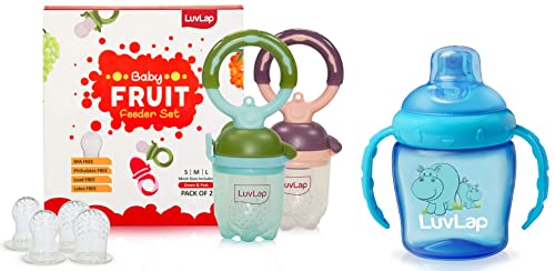 LuvLap Baby food and fruit feeder twin pack with three Feeder Sack sizes BPA Free Green & PinkLuvLap Baby food and fruit feeder twin packs are availble in attractive colors ergonomic designs and makes baby's introduction to solid food and feeding to weaning babies an easiser job. The pack contains 3 different sizes of feeder sack to meet the growing consumption need of the babiesLuvLap Hippo Sipper BlueLuvLap Hippo Spout Sippers are meant for babies' of 6 month + age. The sipper comes with an intelligent spout with touch flo valve which ensures zero spillage. The sipper is made up of BPA free plastic.
