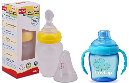 LuvLap Feeding Spoon with Squeezy food Grade Silicone Feeder bottle For Infant Baby 180ml BPA FreeSoft silicone food feeding bottle with spoon can be used to feed puries juice milk or water to babies. Helps in easy transition. Effortless one hand feeding. Extra soft silicone spoon protects baby's teeth. Dust cover to maintain hygiene.LuvLap Hippo Sipper BlueLuvLap Hippo Spout Sippers are meant for babies' of 6 month + age. The sipper comes with an intelligent spout with touch flo valve which ensures zero spillage. The sipper is made up of BPA free plastic.