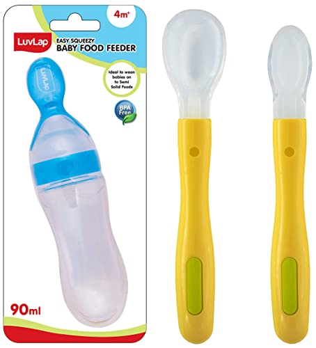 LuvLap Feeding Spoon with Squeezy food Grade Silicone Feeder bottle For Infant Baby 90ml BPA FreeBlueSoft Silicone food feeding bottle with spoon can be used to feed puries juice milk or water to babies. Helps in easy transition. Effortless one hand feeding. Dust cover and disk make it easy to keep and carry.Luvlap Fun Club Baby Silicone Spoon Set BPA Free FDA Approved 2 pcs GreenLifes little stories bloom with coming of the little one in your life. It completes your life with many joys of parenthood. For baby its the next best thing to being in your arms. Entertain your little one and give him or her a personal resting place. Luvlaps high chairs cots walkers and other indoor products will have the whole household floored by babys happy smiles and chuckles. At Luvlap we endeavour to weave the little stories into our products with an emphasis on child safety and enrichment of features. So that your little one gets the comfort thats next only to the warmth of your lap. Conceived with care and made using the latest marvels of science all Luvlap products undergo multiple quality checks before they are dispatched to the stores. The products are available at all leading baby gear and online stores and conform to the european standards.