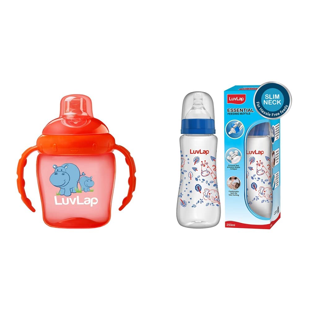 LuvLap Hippo Sipper / Sippy Cup 225ml Anti-Spill Design with Soft Silicone Spout 6m+ (Orange)Luvlap hippo sipper with soft silicon spout is ideal for your 6 months plus baby. The soft silicon spout helps in overall oral development of your child. It has an in-built valve which makes it non- spill and leak proof preventing any unwanted spilling and mess.Luvlap Slim Neck Essential Baby Feeding Bottle 250ml Jungle TalesLuvLap Essential Feeding Bottles are ergonomically designed to be easily held while feeding the baby. All LuvLap bottles are 100% BPA free and fully sterilizable. The teats are 100% Liquid Silicone and have an anti-colic valve that vents air into the bottle preventing any air from entering the babys tummy. The teat has spiral grooves at the tip which encourage peristaltic suckling and help the baby get a comfortable latch. The grooved teats and superior silicone quality ensure no nipple collapse helping in an uninterrupted feed. With the LuvLap Essential Feeding Bottles at your side your babys feed will always be a comfortable one