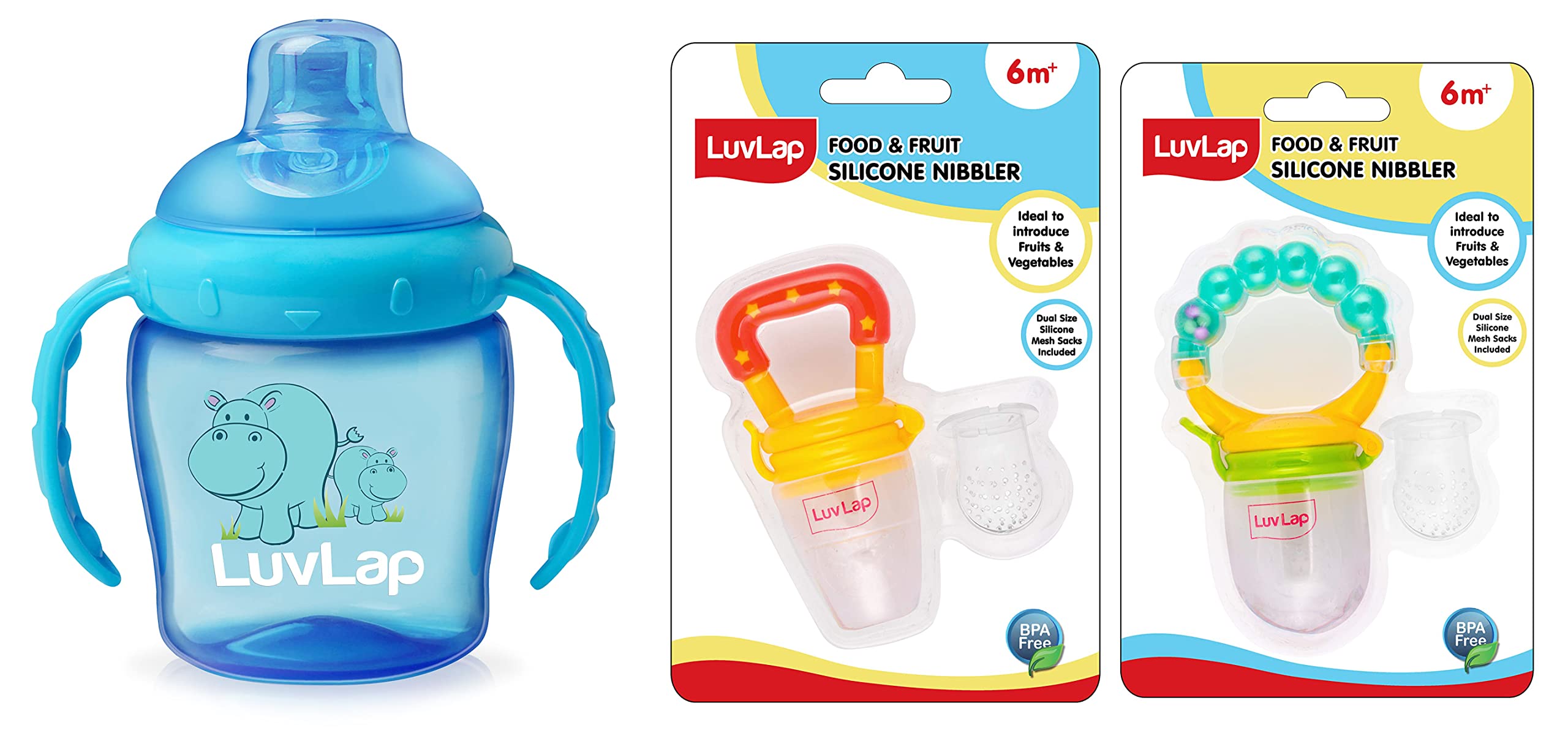 LuvLap Hippo Sipper BlueLuvLap Hippo Spout Sippers are meant for babies' of 6 month + age. The sipper comes with an intelligent spout with touch flo valve which ensures zero spillage. The sipper is made up of BPA free plastic.LuvLap Pearly Food & Fruit NibblerFruit nibbler and teething toy to provide gentle relief to gums. Serves dual purpose of feeding fruit and vegetables to babies and can also be used as a teether. Can be filled with chilled fruits/vegetables to provide added relief. Made with bpa free food grade plastic and soft silicone it comes in attractive handle designs to EN gage the baby and is easy to hold and nibble uponLuvLap Silicone Food/Fruit Nibbler with Extra Mesh Soft Pacifier/Feeder Teether for Infant Baby Infant Joystar Yellow BPA FreeFruit nibbler and teething toy to provide gentle relief to gums. Serves dual purpose of feeding fruit and vegetables to babies and can also be used as a teether. Can be filled with chilled fruits/vegetables to provide added relief. Made with bpa free food grade plastic and soft silicone it comes in attractive handle designs to EN gage the baby and is easy to hold and nibble upon.