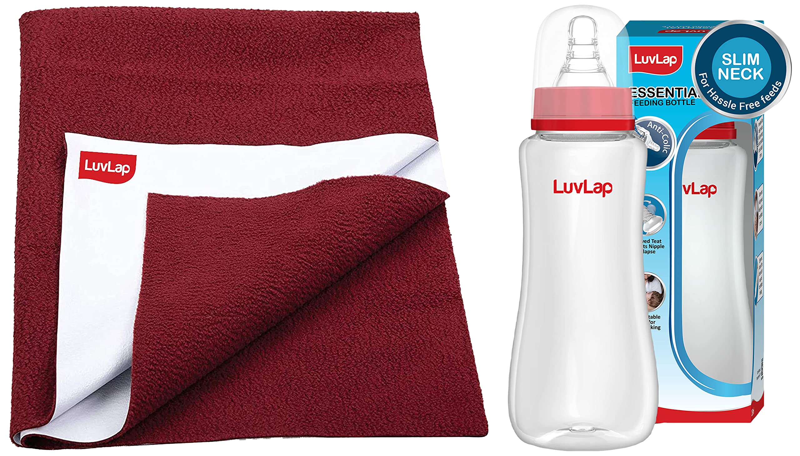 LuvLap Instadry Anti-Piling Fleece Extra Absorbent Quick Dry Sheet for baby Baby Bed Protector Waterproof baby sheet Small size 50x70cm Pack of 1 MaroonLuvLap instadry extra absorbent sheet come with soft and breathable material lightweight and easy to carry.LuvLap Anti-Colic Slim/Regular Neck Essential Baby Feeding Bottle 250ml New Born/Infants/Toddler Upto 3 Years BPA Free White and Red Pack of 1LuvLap Essential Feeding Bottles are ergonomically designed to be easily held while feeding the baby. All LuvLap bottles are 100% BPA free and fully sterilizable. The teats are 100% Liquid Silicone and have an anti-colic valve that vents air into the bottle preventing any air from entering the babys tummy. The teat has spiral grooves at the tip which encourage peristaltic suckling and help the baby get a comfortable latch. The grooved teats and superior silicone quality ensure no nipple collapse helping in an uninterrupted feed. With the LuvLap Essential Feeding Bottles at your side your babys feed will always be a comfortable one