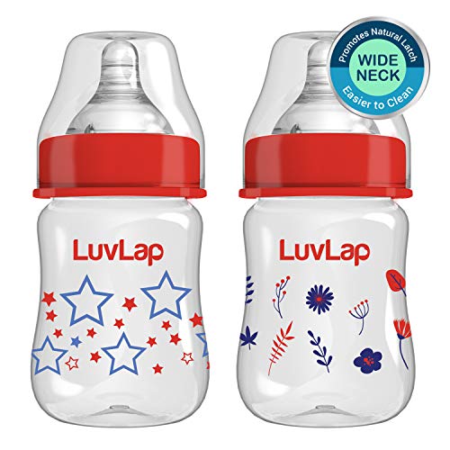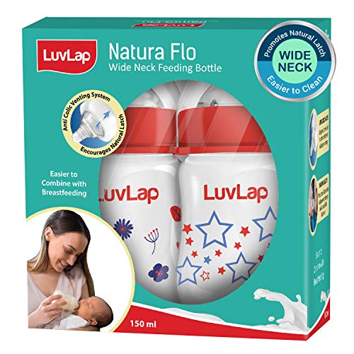 LuvLap Naughty Duck Sipper / Sippy Cup 280ml Anti-Spill Design with Soft Silicone Straw 12m+ (Yellow)LuvLap naughty duck straw sipper comes with a spill proof weighted straw. Weighted straw allows child to drink at any angle easily. Ergonomically designed easy grip handles are specially designed as per requirement of small baby hands.Luvlap Wide Neck Natura Flo Baby Feeding Bottle 150ml Pack of 2 Floral & StarsLuvLap Natura Flow Feeding Bottles are ergonomically designed to be easily held while feeding the baby. All LuvLap bottles are 100% BPA free and fully sterilizable. The teats are 100% Liquid Silicone and have an anti-colic valve that vents air into the bottle preventing any air from entering the babys tummy. The teat has grooves at the tip which encourage peristaltic suckling while the wide base helps the baby get a natural latch similar to that on the mothers breast. This helps easy transition between breastfeeding & bottle feeding. The grooved teats and superior silicone quality ensure no nipple collapse helping in an uninterrupted feed.
