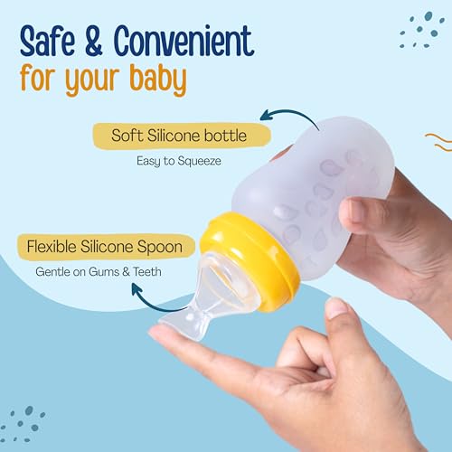 Soft silicone food feeding bottle with spoon can be used to feed puries juice milk or water to babies. Helps in easy transition. Effortless one hand feeding. Extra soft silicone spoon protects baby's teeth. Dust cover to maintain hygiene.
