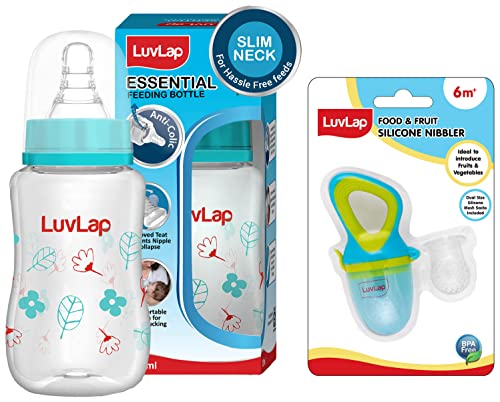 LuvLap Silicone Food/Fruit Nibbler with Extra Mesh Soft Pacifier/Feeder Teether for Infant Baby Infant Elegant Blue BPA FreeFruit nibbler and teething toy to provide gentle relief to gums. Serves dual purpose of feeding fruit and vegetables to babies and can also be used as a teether. Can be filled with chilled fruits/vegetables to provide added relief. Made with bpa free food grade plastic and soft silicone it comes in attractive handle designs to EN gage the baby and is easy to hold and nibble upon.Luvlap Anti-Colic Slim Wild Flowers BPA-free Regular Neck Baby Feeding Bottle 125ml GreenLuvLap Essential Feeding Bottles are ergonomically designed to be easily held while feeding the baby. All LuvLap bottles are 100% BPA free and fully sterilizable. The teats are 100% Liquid Silicone and have an anti-colic valve that vents air into the bottle preventing any air from entering the baby?s tummy. The teat has spiral grooves at the tip which encourage peristaltic suckling and help the baby get a comfortable latch. The grooved teats and superior silicone quality ensure no nipple collapse helping in an uninterrupted feed. With the LuvLap Essential Feeding Bottles at your side your baby?s feed will always be a comfortable one