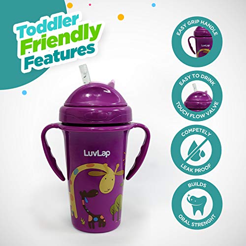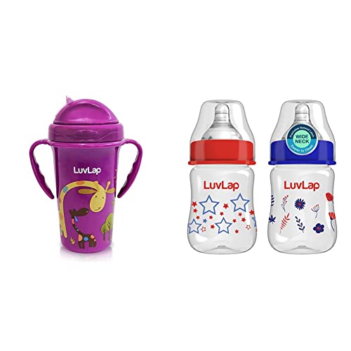 LuvLap Tiny Giffy Sipper / Sippy Cup 300ml Anti-Spill Design with Soft Silicone Straw 18m+ (Purple)Attractive sippers in various designs and colours. Made from non toxic BPA free plastic and soft silicone. Silicone straw helps in building oral strength. Ergonomically designed easy to hold and drink from.Luvlap Wide Neck Natura Flo Baby Feeding Bottle 150ml Pack of 2 Floral & StarsLuvLap Natura Flow Feeding Bottles are ergonomically designed to be easily held while feeding the baby. All LuvLap bottles are 100% BPA free and fully sterilizable. The teats are 100% Liquid Silicone and have an anti-colic valve that vents air into the bottle preventing any air from entering the babys tummy. The teat has grooves at the tip which encourage peristaltic suckling while the wide base helps the baby get a natural latch similar to that on the mothers breast. This helps easy transition between breastfeeding & bottle feeding. The grooved teats and superior silicone quality ensure no nipple collapse helping in an uninterrupted feed.