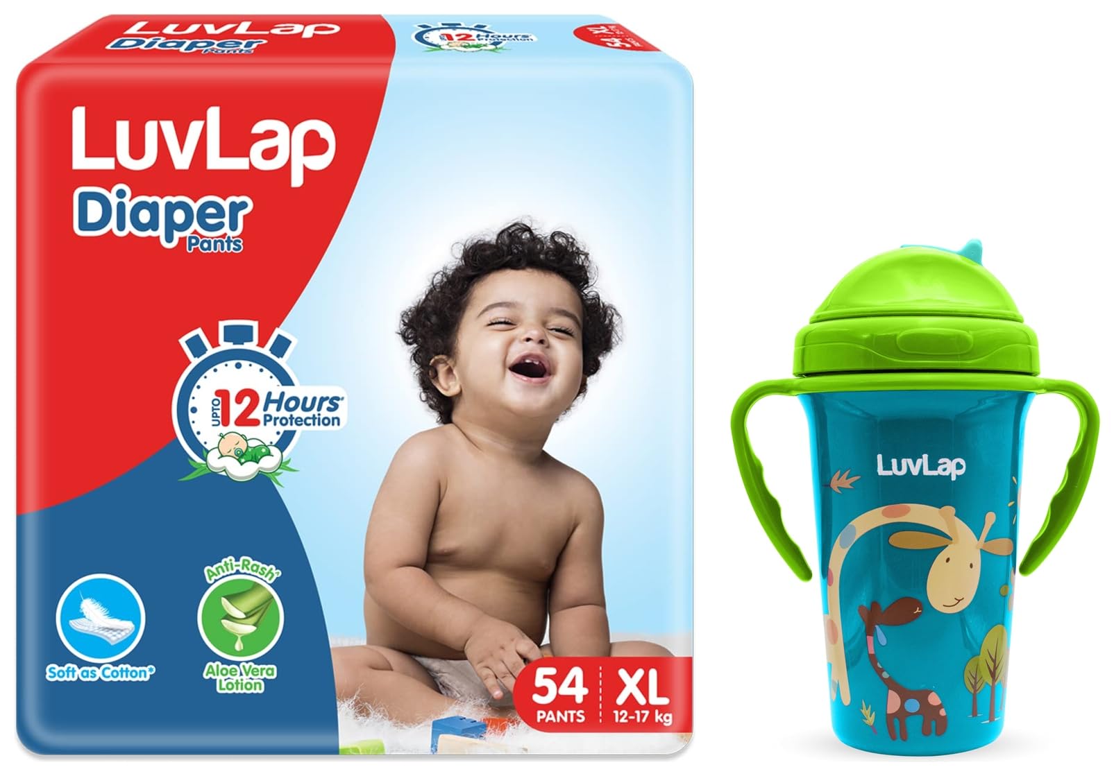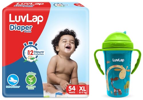 LuvLap Tiny Giffy Sipper for Infant/Toddler 300ml Anti-Spill Sippy Cup with Soft Silicone Straw BPA Free 18m+ (Green)Attractive sippers in various designs and colours. Made from non toxic BPA free plastic and soft silicone. Silicone straw helps in building oral strength. Ergonomically designed easy to hold and drink from.LuvLap Baby Diaper Pants XL Size (12-17kg) Pack of 54 Count with Aloe Vera Lotion for rash protection with upto 12Hr protection For babies of 12 to 17KgAvailable sizes - Newborn (upto 5Kg) Small (4-8 Kg) Medium (7-12Kg) Large (9-14Kg) XL (12-17Kg)