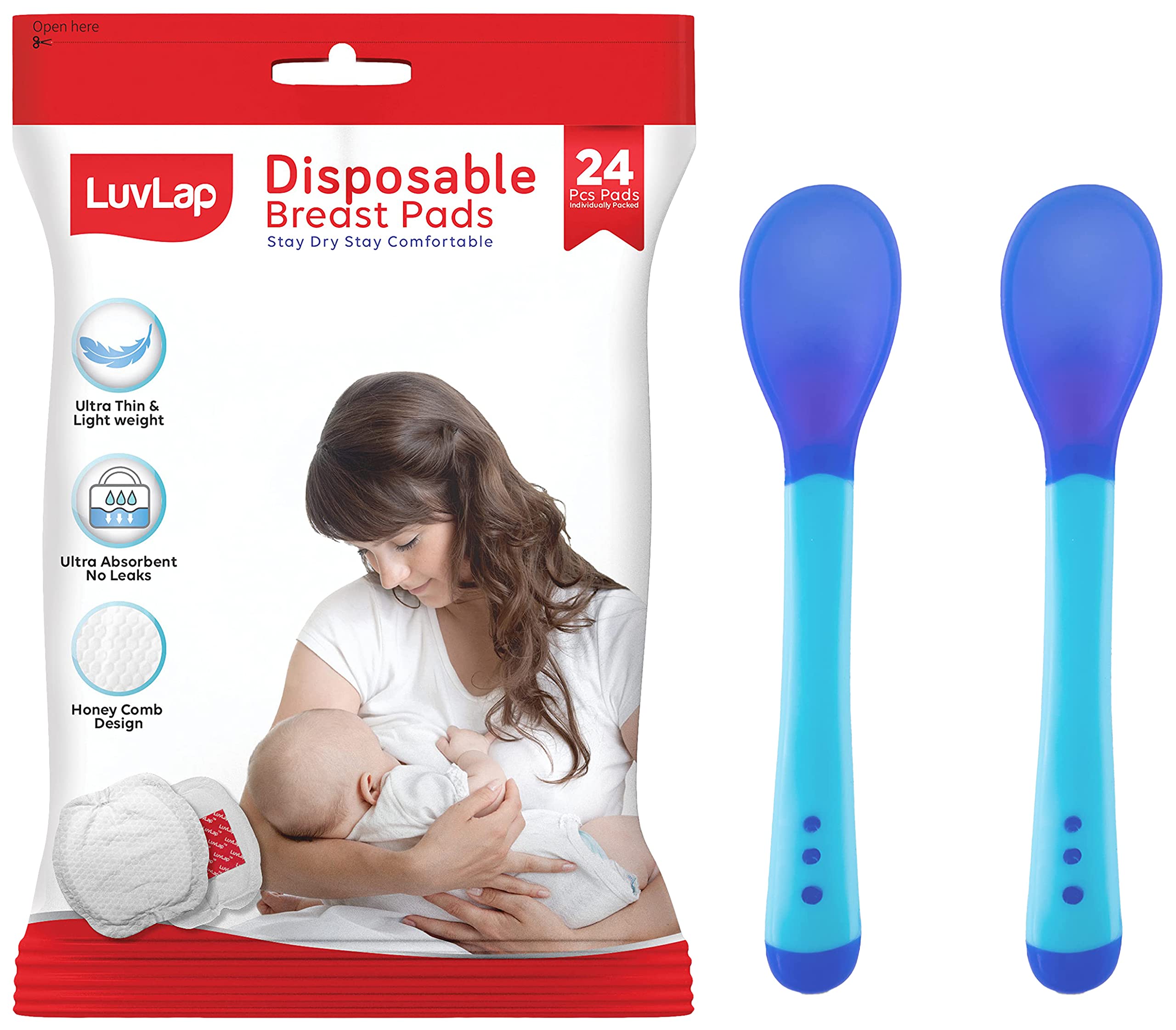 LuvLap Ultra Thin Honeycomb Nursing Breast Pads, 24pcs & Tiny Love Heat Sensitive Baby Feeding Spoons Set, 2 pcs, Blue