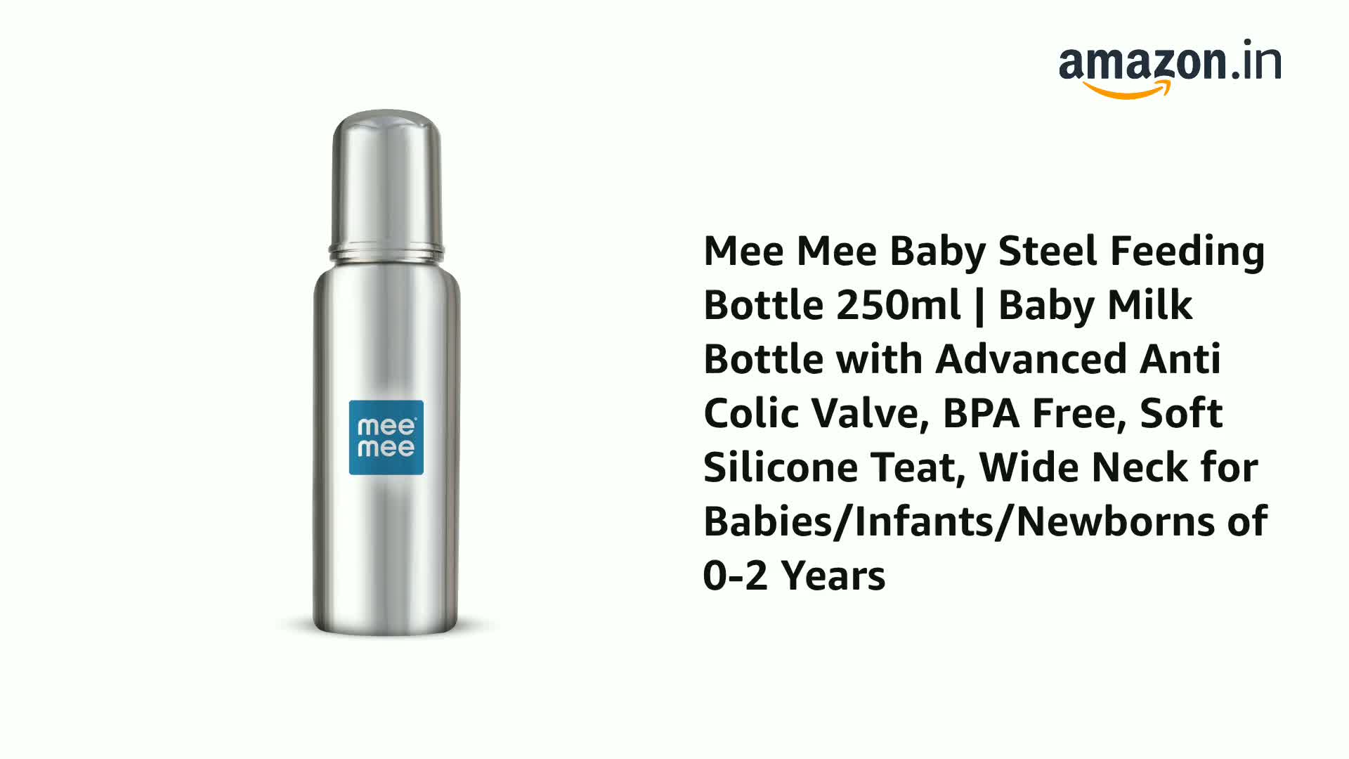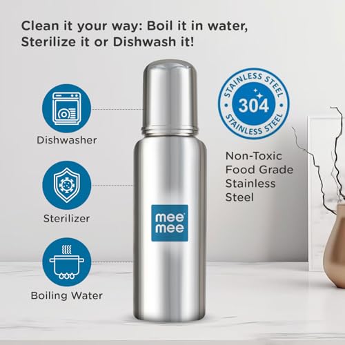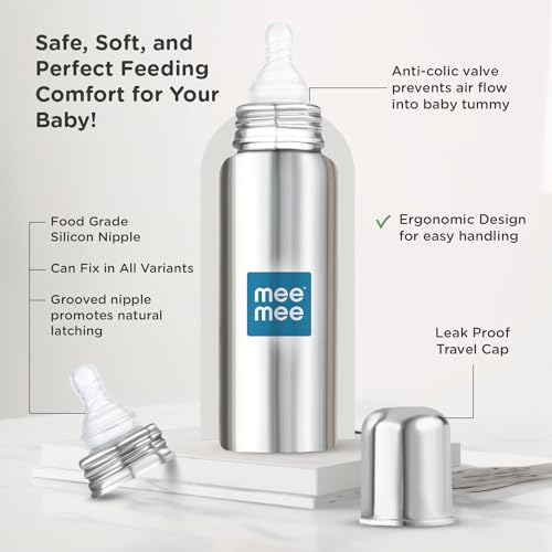HomeBabyFeedingFeeding AccessoriesMee Mee Baby Steel Feeding Bottle 250ml | Baby Milk Bottle with Advanced Anti Colic Valve, BPA Free, Soft Silicone Teat, Wide Neck for Babies/Infants/Newborns of 0-2 Years