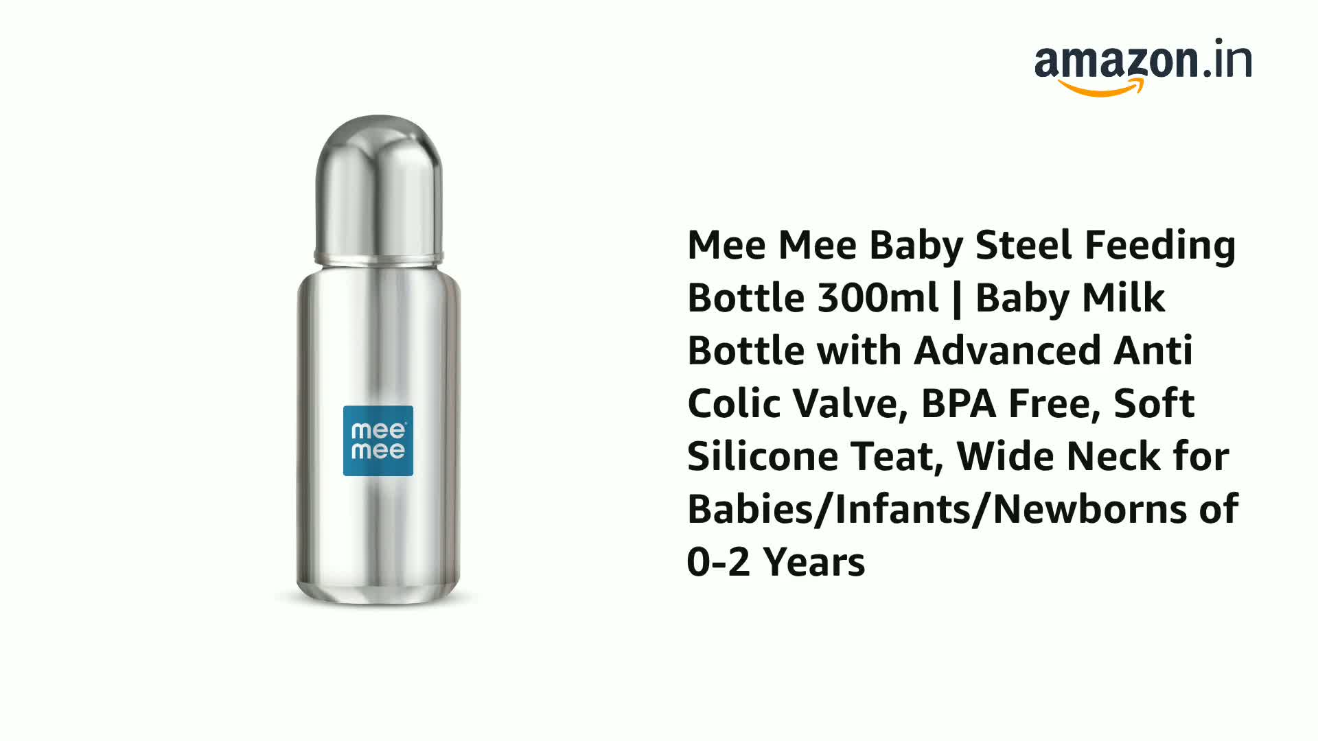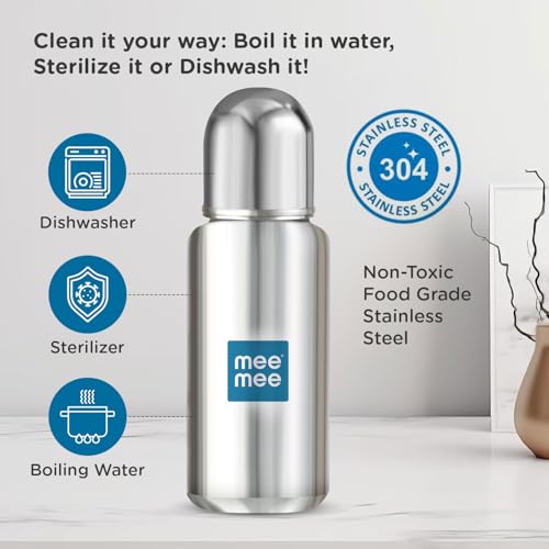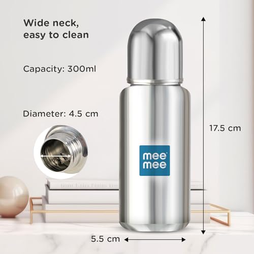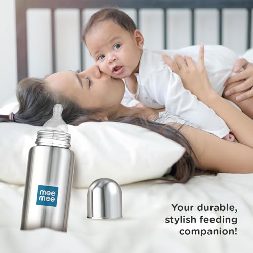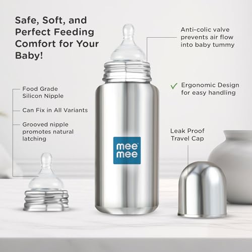 HomeBabyFeedingFeeding AccessoriesMee Mee Baby Steel Feeding Bottle 300ml | Baby Milk Bottle with Advanced Anti Colic Valve, BPA Free, Soft Silicone Teat, Wide Neck for Babies/Infants/Newborns of 0-2 Years