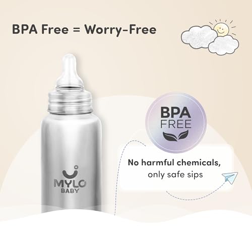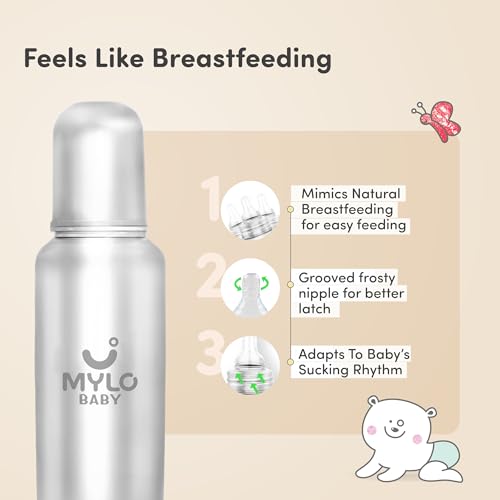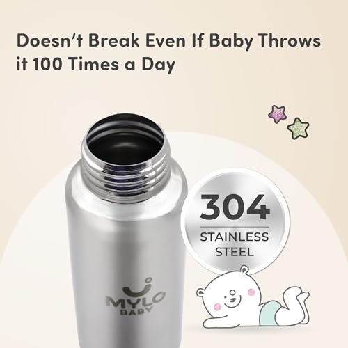 Mylo Baby Stainless Steel Feeding Bottle & Sipper | BPA Free | Anti-Colic | 100% Food Grade | Feels Natural Baby Bottle | Non-Toxic Rust Free (Stainless Steel, 250ml)