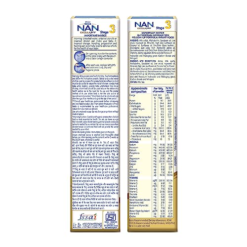 Nestle NAN EXCELLAPRO 3 is a spray dried follow-up formula with DHA ARA Vitamins A C D Calcium Zinc and Iron for infants after 12 months and up to 24 months when they are not breastfed. Nestle NAN EXCELLAPRO 3 contains DHA. DHA helps support normal brain development. Also contains Iron. Iron helps support normal cognitive development. Contains Vitamins A C and Zinc. Vitamins A C and Zinc contribute to normal immune system function. Contains Calcium and Vitamin D. Calcium and Vitamin D help support normal growth and development of bones. 155 years of expertise in Infant Nutrition Nestle develops infant nutrition products backed by evolving science and research. Innovation has been at the heart of Nestle since its beginning. Nestle agrees with the World Health Organization and other medical and health associations that breast milk is the best and the most natural food for babies. Important Notice: Mother's milk is best for your baby.