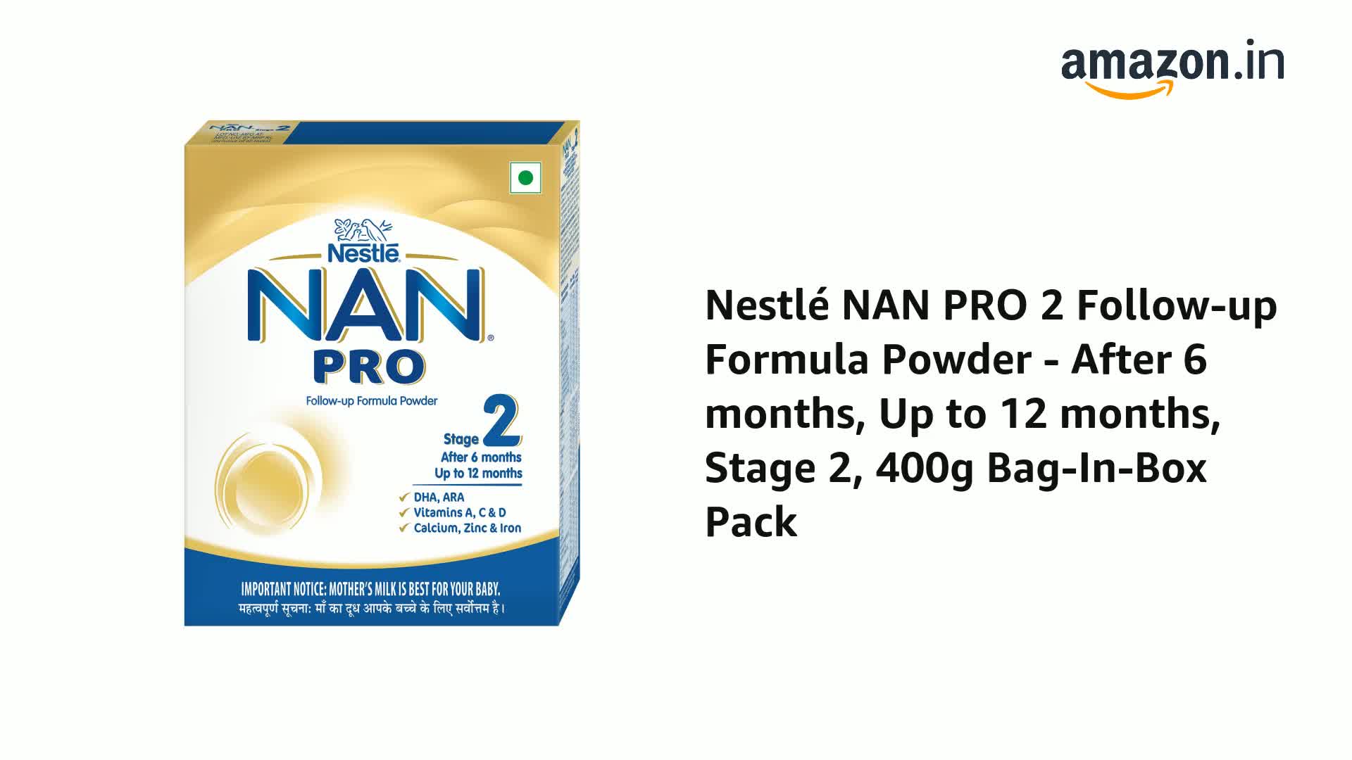 • Nestle NAN PRO 2 is a spray dried follow-up formula with DHA ARA Vitamins A C D Calcium Zinc and Iron for infants after 6 months and up to 12 months when they are not breastfed.