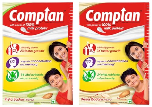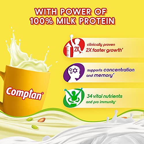 Complan is a Dairy-based Beverage Mix' a Nutrition drink powder scientifically designed to meet the nutritional needs of growing children. Its Kesar Badam Flavour is a nutritious drink with a delicious taste that your kid will enjoy. It provides essential nutrients including 100% milk protein vital for their development. Complan contains 63% more protein (per 100g and per serve basis) than regular Malt-based Food Drink powder. Its formulation with 34 key nutrients such as Vitamin D2 calcium Zinc etc. is designed to support overall growth and functioning. Complan is clinically proven to support 2X faster growth and supports memory and concentration. This nutrition drink for kids contains essential nutrients like iodine iron zinc etc. that are known to support brain development and functioning. The pro-immunity nutrients like Vitamin A Vitamin C etc. support immune function. Serve this delight twice a day (33g x 2) as a part of your child's balanced diet. It can be served in two delicious ways both as a hot drink and a cold drink. Give your child the Complan nutrition.