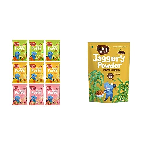Slurrp Farm Teething Puffs | Fruit and Vegetable Puffs Baked in Yummy Flavours- Carrot Strawberry & Banana Mango | Pack of 9Made by two mothers with love.Slurrp Farm Natural Jaggery Powder 300 GSlurrp Farm is founded by two mothers for their children and yours. Our mission is to provide tasty and all natural alternatives to the junk food that surrounds us today. This means no preservatives no artificial flavours and no artificial colours. We are passionate about raising awareness of healthy eating for children by giving parents convenient food options which are as good as what we would make at home.