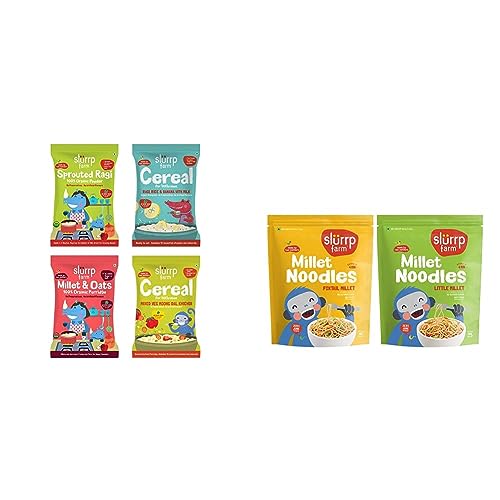 Slurrp Farm No Sugar No Salt Cereal Starter Combo | Made with Ragi Oats Jowar Real Fruits Vegetables Dals | Healthy Food for Kids | Easy to cook | 50 g*4 Convenient trial size packs of 50g each of Organic Sprouted Ragi Millets and Oats porridge Ragi Banana with Milk Cereal and Moong Dal Khichdi Cereal No sugar salt preservatives artificial colours or flavours | Easy to digest single and multigrain cereals: ideal early foods for little ones Sprouted Ragi is a powerhouse of calcium: 10x that of wheat and rice | Millets and Oats porridge is packed with fibre Banana Cereal and Moong Dal Khichdi cereal contains 13 essential vitamins and minerals. 2 serves of Banana cereal provide 60% of your toddler daily iron needs basis who guidelines Traditional and wholesome foods made by Two MothersSlurrp Farm No Maida Millet Noodles | Not Fried No MSG | Foxtail Millet and Little Millet Noodles Combo | Pack of 2-192g EachNo maida refined sugar and palm oil not fried