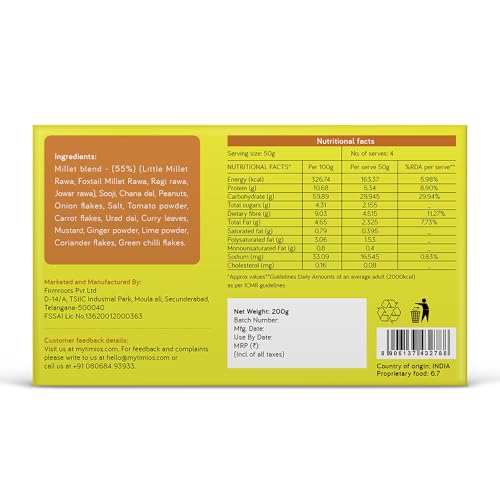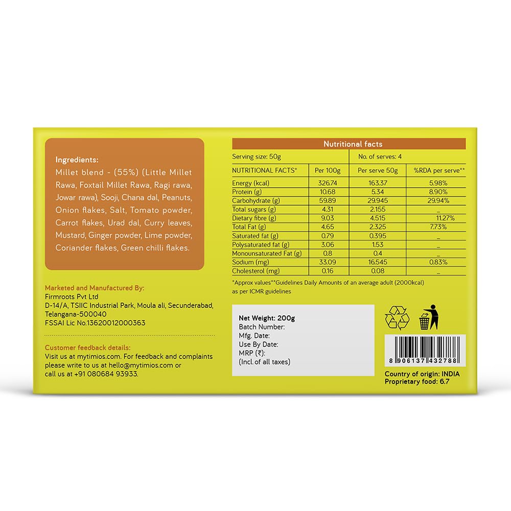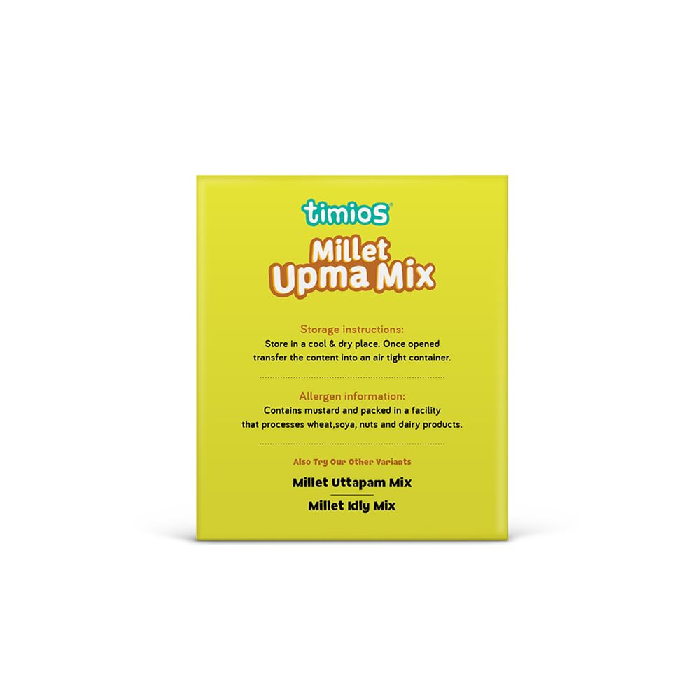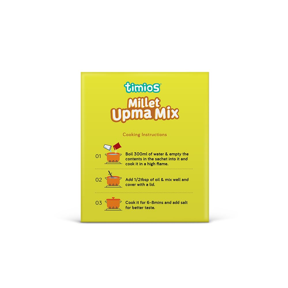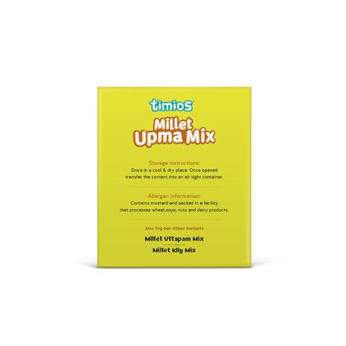 Eating healthy just got better! timios brings to you a delicacy from South India that is 100% healthy & 100% tasty. A quick and easy breakfast solution perfect for busy mornings. Timios millet upma is an instant mix made with ingredients like millet rawa ragi rawa jawar rawa sooji chana dal peanuts Urad dal & nourishing vegetables. These have high quantities of nutritients like proteins iron calcium essential vitamins & minerals for a power packed day supporting healthy growth and development.