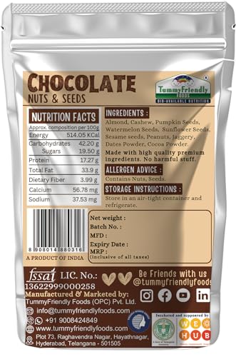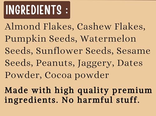 • Ingredients: Almonds Cashew Pumpkin Seeds Watermelon Seeds Sunflower Seeds Sesame seeds Peanuts Jaggery Dates Powder Cocoa Powder. Tummy Friendly Chocolate Nuts and Seeds Mix. Healthy Snacks for kids. No Sugar No Chemicals No Preservatives