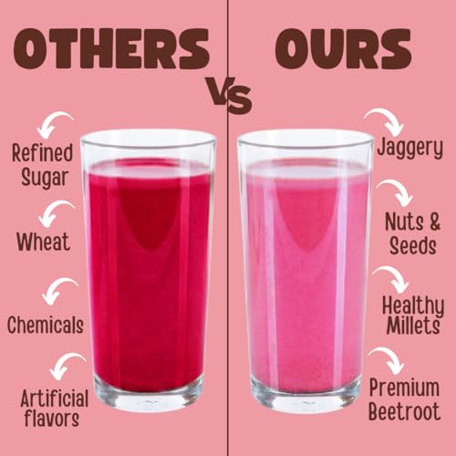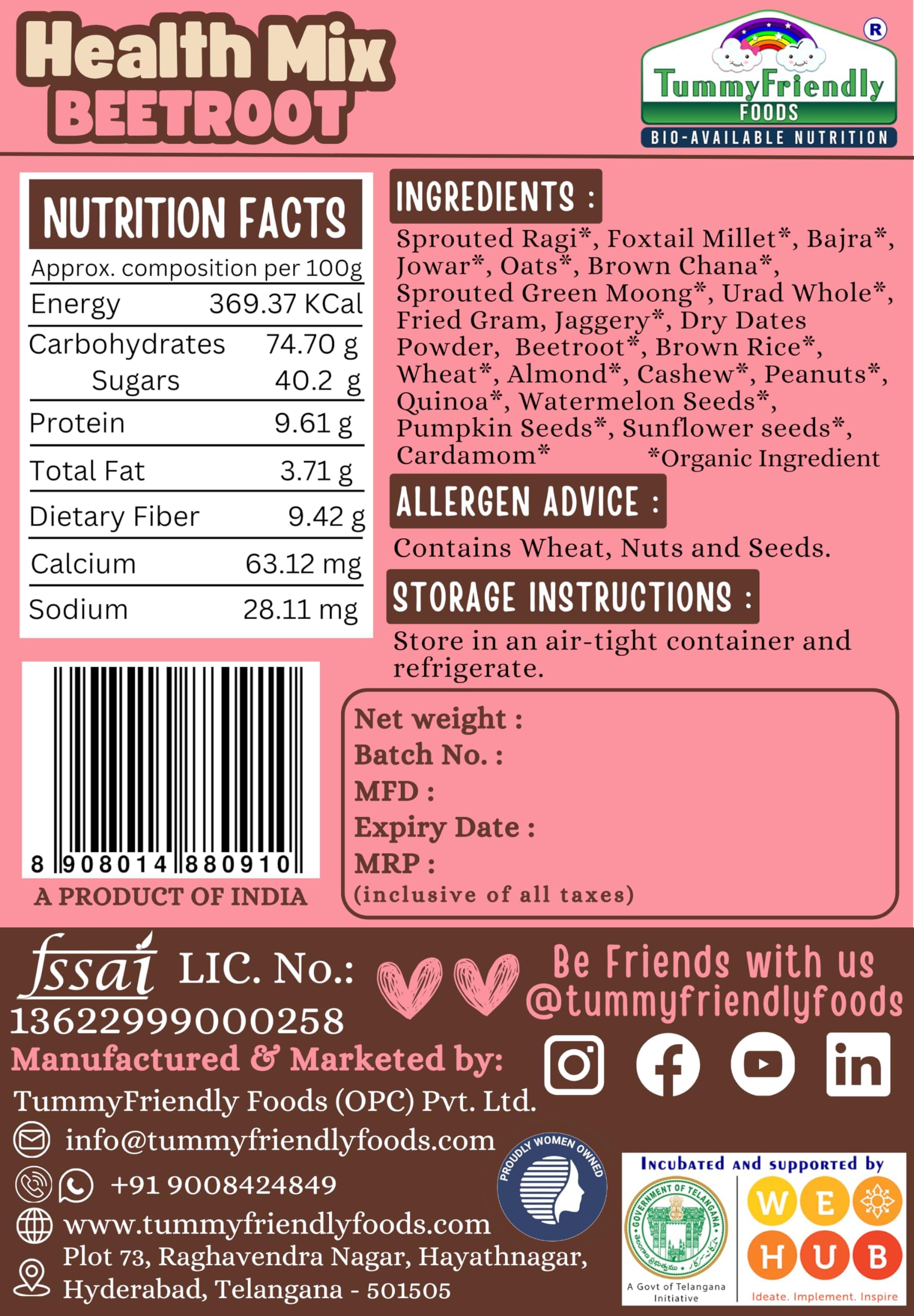 TummyFriendly Foods Organic Beetroot Health Mix For Kids - 300g. Introducing our Organic Multi Grain Health Mix Powder - the ultimate health drink for kids! Crafted with care and packed with goodness this nutritious blend is specially formulated to provide essential nutrients for growing children. Say goodbye to sugar worries! Our health drink for kids without sugar offers a healthy option for parents seeking wholesome alternatives. Made with natural ingredients it's a deliciously healthy choice that kids will love. Created with the well-being of children in mind our health mix for kids is homemade with love. We understand the importance of nourishing your little ones with the best which is why our blend is free from artificial additives and preservatives. Suitable for ages 2-6 years our health mix for kids malt is designed to support their growth and development. With a rich combination of grains it's a powerhouse of nutrients that helps fuel their active lifestyles. Looking for a Healthy Milk Mix powder for kids? Look no further! Our Health mix for kids is the perfect solution. Packed with vitamins and minerals it's an easy and convenient way to ensure your child gets their daily dose of goodness. Make the switch to our Organic Multi Grain Health Mix Powder today and give your kids the gift of health and vitality. With every sip they'll be nourished energized and ready to take on the world!